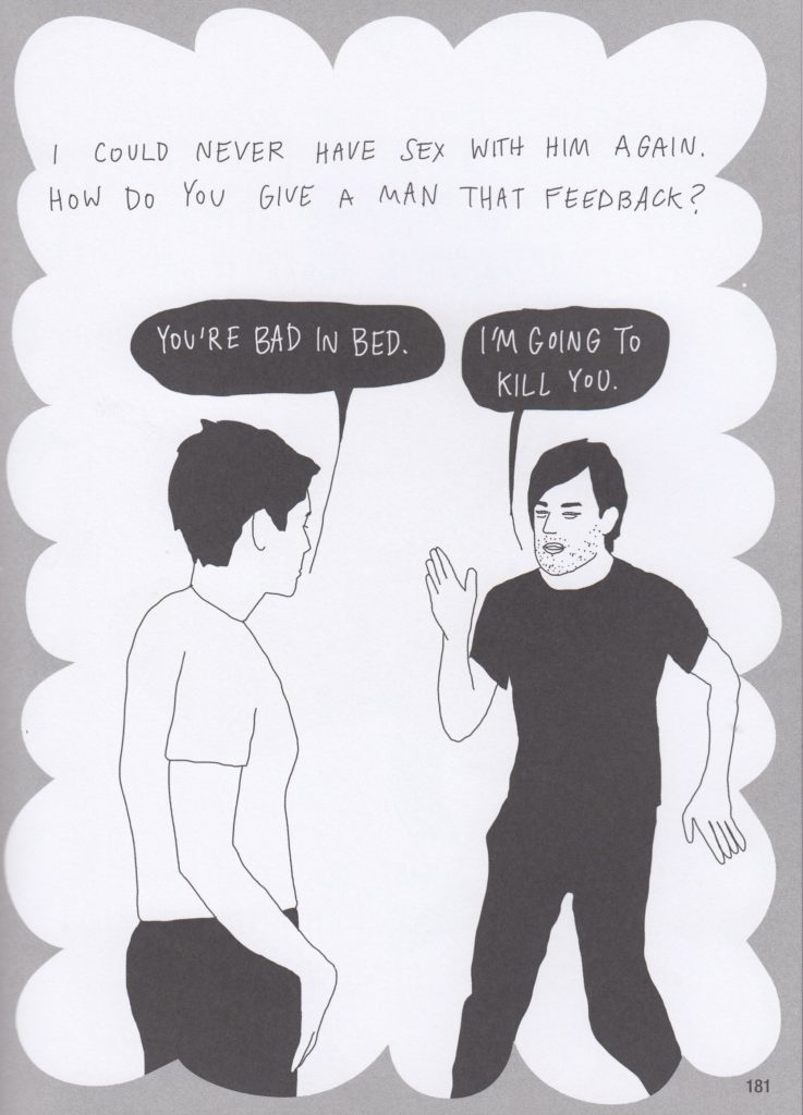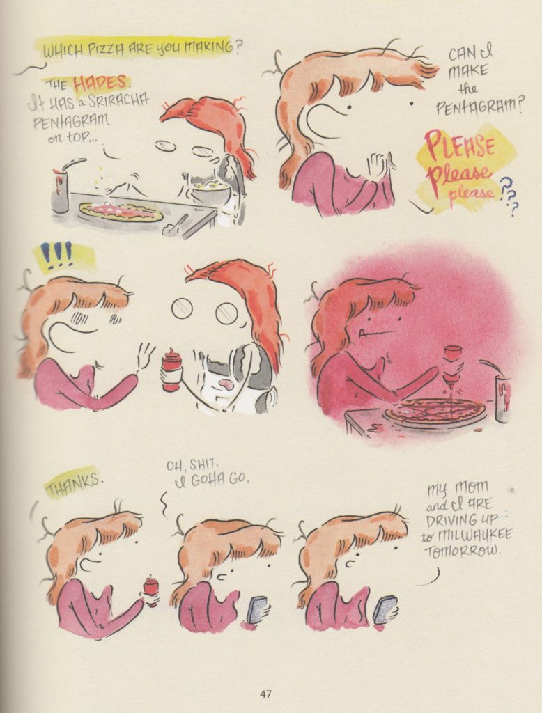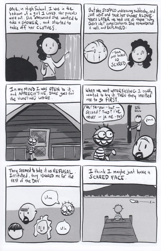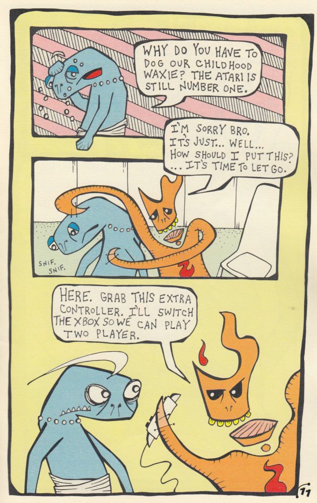 I’m doing my level best to stay focused on this comic, but did you know that she has a comic on her website that’s made entirely out of felt, encased in a felt cheese grater? Granted, it was purchased for a book collection and is not for sale, but wow is that thing ever impressive. It looks like Hannah is working on her first graphic novel at the moment, but she does have a few other comics available, so it’s not like she’s brand new to this. And the bags she has available for sale! OK, I’m wandering far away from this comic, but seriously, check out her website. This is a flip book that’s also an accordion comic, meaning that each of the covers above depicts a different time in her life, and that you need to pull the comic out like an accordion to read it. Kids, accordions are musical instruments that… nah, I don’t have the energy for that. If you can’t picture it, you’re already on the internet, so I’ll bet you know how to find a picture of one. The comic is a snapshot of moods, one where she’s surprised at how casually she ended up with a girlfriend living with her and another by how much better her next relationship is by comparison. It’s a shortie, so there’s not a whole lot to say about it other than it’s universally relatable to everybody who’s ever thought they had it good only to finally find the real thing. The craftsmanship of this book is impressive too; part of my reviewing so many comics over the years means that I’ve reviewed several accordion comics by now, and they inevitably seem to start falling apart after a few reads. This sucker is sturdy and would take some serious effort to pull apart (not that I recommend trying). After reading this I’m very curious about her upcoming graphic novel, so you can expect that to be reviewed here after next year’s Cartoon Crossroads (or sooner if I see it at Chicago Comics or something). $20