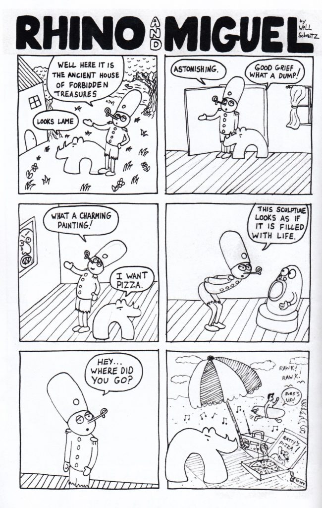 Have I run out of words to talk about King Cat? No! But I must confess, I’m currently spending a lot more time sitting here and thinking about the comic that I am writing about it. And if you were looking at a sped up recording of me typing this review (you creep), then you’d see me getting up and puttering around the house a bit rather than my usual business of madly typing until all of the thoughts are out of my head. Um, a peek behind the curtain there, I guess. Maybe it’s because these books are rare and I’m trying to savor it? Probably, because if you think this is the issue where I’m finally going to stop recommending this book, you are completely mistaken. There’s a lot of death this time around, as John’s mother, cat and one of his best friends have all passed away since the last issue. He’s as open as it’s possible for a person to be while talking about these events, and I doubt very much that you’ll be able to get through this comic without crying a few times. But there’s funny stuff in here too, so don’t go thinking it’s entirely grim. Other stories in here deal with John trying to get woodchucks to stop pecking holes in his gutters (in hilariously cartoonish fashion), tasting the dog, unwelcome visits from the cat while sitting on the toilet, how many geese are in the picture, trying to make the ultimate pattern for a dream machine, things left on the nightstand, remembering a trip to the circus and how Zorro fit into it, learning the Dewey Decimal System from a nun while having class outside, a few Buddhist stories, and several more quiet pieces. Of course there’s also his top 40 (and at this point I’d genuinely have to read all of his old comics again to see if it was ever actually exactly 40), several pages of brief synopses of dreams, how he picked out his dog Gretel, and several pages of letters. Look, his comics are a whole mood, and mine instantly improves any time I see a new issue in the mail or at a comics shop. If you’ve somehow made it this far if life without reading any of his comics, fix that already! $7