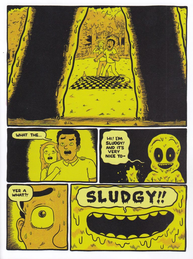 Maybe some day I’ll understand why it’s so rare for artists to have simple ways to buy their comics on their websites, but that day is not today. The link goes to a store that is currently sold out, but hey, maybe they’ll get more copies! Also back in my review for #13 I figured out that Nick is doing more continuing stories now and that I should stop my habit of reviewing random issues. I then promptly forgot all about that before reviewing this one. Better luck next time! This is a collection of several short pieces that are almost certainly parts of larger stories, but I’ll do my best. First up is the story of a badger having a conversation with several animals. He tells them that he has a secret he’d like to share with them… but only if they give up something they value. Next up is the shortest story, starring our hero the eyeball, discovering drinking, dancing and fun. I’m guessing this would have made a lot more sense in context, but I’ll get there eventually. Next is an equally short piece about an amnesiac with a cooked chicken (attached to a penis) for a head waking up in the back of an unknown vehicle. The next piece looks like the start of a story, as it deals with a young man who gets in an accident, rejects death, comes back to life and has a series of visions when he’s drifting in and out of consciousness. Finally there’s a baffling piece about a snake and a… sentient zit? The management here at Optical Sloth (me, it’s always and forever just been me) regrets not reading the previous issues for context, and will get on that in the near future. Before the end of 2025 is my pledge to you! And since it’s already mid-November, that’s serious business. The bottom line is that Nick is still putting out quality comics at an impressive pace, and I’m content just to watch his mind work, even without full context. If you’re like that too, give this one a shot! If not, the man has at least two collections available, maybe start with one of those and see what you think. $7