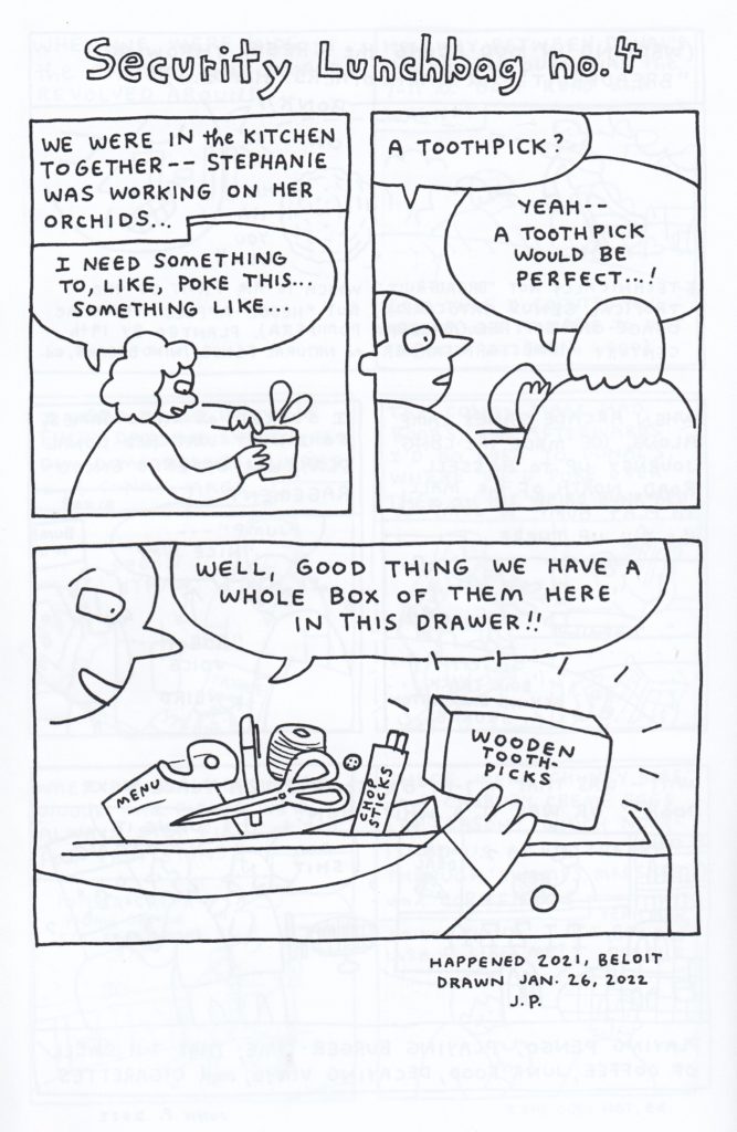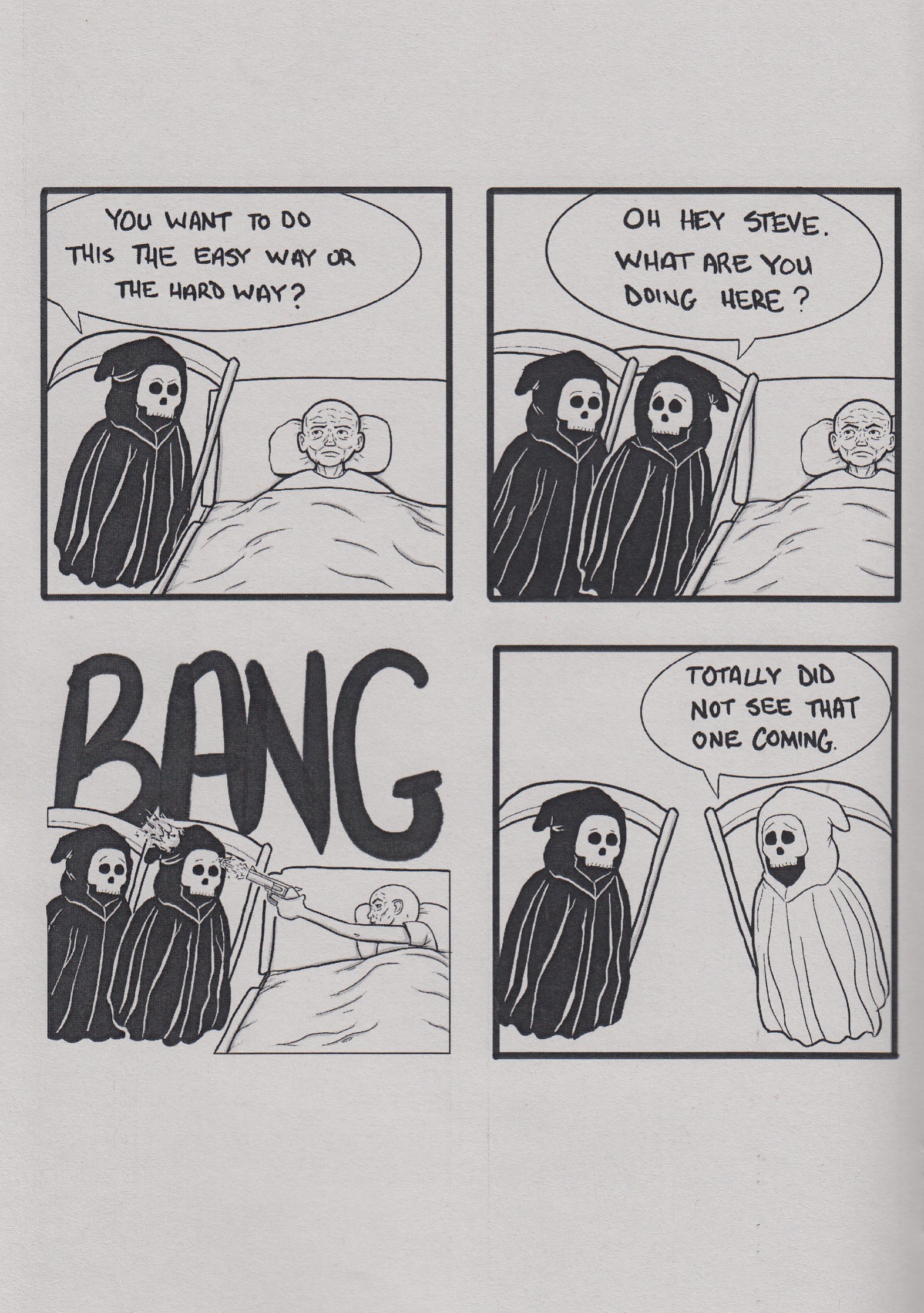 I mean, I was VERY tempted to call this “Oh Peas and Carrots,” but I doubt very much that that’s actually the title of this mini. Which led me to conclude that there probably wasn’t a title at all, so here we are! This is a delightful comic, which folds out to show different excuses for calling in sick for every day of the week. I doubt very much that any of them would work in a practical sense, but they were funny, and hey, if you’re on your way out at your job anyway, try a few of these out to see what happens! There’s also a recipe for hot dog sauerkraut casserole, which sounds horrific to me because I can’t stand sauerkraut, but honestly? The rest of it sounds pretty damned good. Which overall makes this comic pretty practical, right? Excuses for getting out of work and a workable recipe. His art style reminds me slightly of Max Clotfelter, mostly because of those densely penciled black backgrounds, but Max still has a leg up on him for sheer sordidness (which I mean in the best possible way). I managed to grab a few more of Glenn’s comics at the con and it doesn’t look like any of them have a title, so it’ll be fun trying to keep these all straight in the weeks ahead. Oh well, reviewer problems, I guess. One comic in from the guy and I’m intrigued, so check this out if you get the chance. $2 maybe?