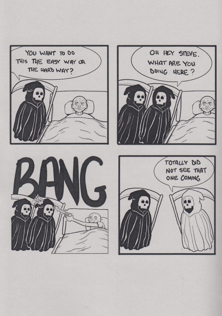 Is there a word for the feeling you get when you realize that the comic that you randomly bought from an artist at a comics convention was, in hindsight, probably not the best choice out of their available work? Eh, probably not. It’s just that in looking up Stephen’s info for this review, his Upstate series seems like it’s much more my type of thing, especially since I have no attachment to Sonic, or even enough knowledge of the characters to get what I’m pretty sure are most of the jokes in this comic. Still, I had a good time reading it, and that ending got a legit chuckle out of me. As you may have guessed, this is kinda sorta a parody of Sonic the Hedgehog, the lead character of a series of games, comics and cartoons, but set in the far future. Sonic (Mach in this book; if there’s a character actually named Mach and I’m getting this all wrong, I’m OK with that level of ignorance) starts off this comic in a grand fight with the evil Professor, and we’re quickly made aware that this is a flashback and Mach is actually an elderly hedgehog who’s being cared for by a robot. The rest of the book is an appreciation dinner for Mach (that he wants no part in), Mach catching up with an old enemy and, like I said, one fantastic ending. If you’ve got a lot of love for this character/series I’m sure there’s plenty here that I missed, but if you’re going into it fairly new like me there’s still funny stuff in here. $7