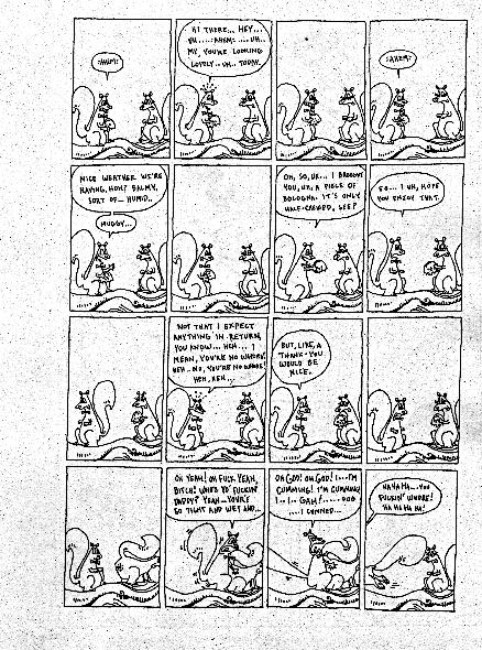 As you can see from the cover, this book is a treatise on the subtleties of the Middle East crisis… nah, just kidding. It’s a comic about squirrels being whores, killing children, hitting on anything with “grass on the field”, a video game about 9/11, Homeless Harry, old white ladies, Darwin Dong and some really silly superhero parodies. They’re in the minority though, so there’s nothing to worry about. Is it in good taste? No, not even close, but since when does something have to be in good taste to be funny? If you don’t mind being really grossed out by some things and even probably genuinely offended (hey, I’m sure it’s possible to make fun of 9/11 but the page strip in here was pretty tacky, unless you have thicker skin than I do, then it was hilarious), then this book is for you. I’m just gratified with the sheer number of funny mini comics I’m seeing these days. Keep them coming, poor cartoonist America! E-mail the guy to see what he has, there’s no address or website in the comic…