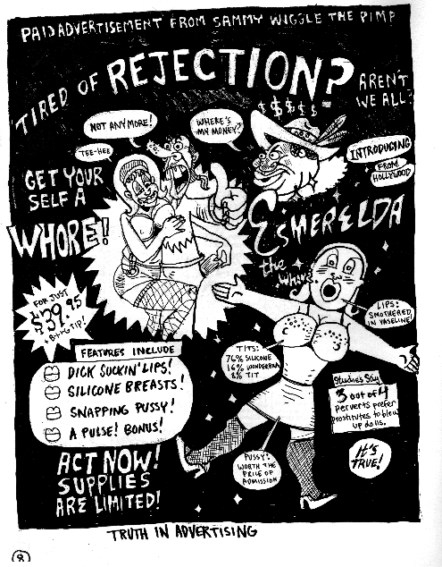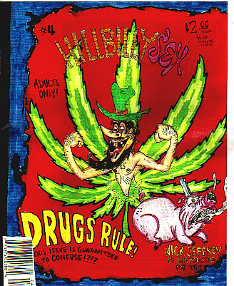 OK, this is basically a review of #2-4, although I’ll probably go into more of the details of the individual issues when I have more time/when I feel less lazy. Reading three of these in a row is, frankly, an assault on the senses and I don’t have it in me to dissect three issues at once. Tastelessness is fine, going for the gross-out is fine, it’s just… after a while, wouldn’t it be funnier to NOT do the most offensive thing you can think of in a strip? Just make it bright and shiny to freak people out or something? Just a thought, but I’d love to see a children’s book from this guy to see some range, because there’s real talent here. He’s not anywhere near as bad as Jeff Johnston seems to think (the review is reprinted in #2) where he basically says that Nick is all that’s wrong with comics today. Not that I’m saying he’s the second coming or anything, but does it make me a total moron to find some of his stuff hilarious? At times he’s like a much less polished Ivan Brunetti, which isn’t his best stuff. His best stuff is his longer work, like the story where his character, Darwin Dong, confronts God (who actually turns out to be Burt Reynolds) and gets a lesson on love. Or there’s the story of Darwin befriending and eventually falling in love with a dog. Things I don’t like so much: most (but not all) of the four panel comics are stupid, but I mostly don’t like four panel strips, so take that with a grain of salt; same with most of the one panel gag strips. I like how he put the scathing review of his work on the inside cover and his biographies of various people (Lydia Lunch, Mike Diana and Gil-Scott Heron, so far) are short and informative. I’d say that #3 is your best bet if you just want to check one of them out, and #4 is probably the weakest overall. He also has a strange obsession with wrestling, not that there’s anything wrong with that. It’s $2 per issue, contact info is above.