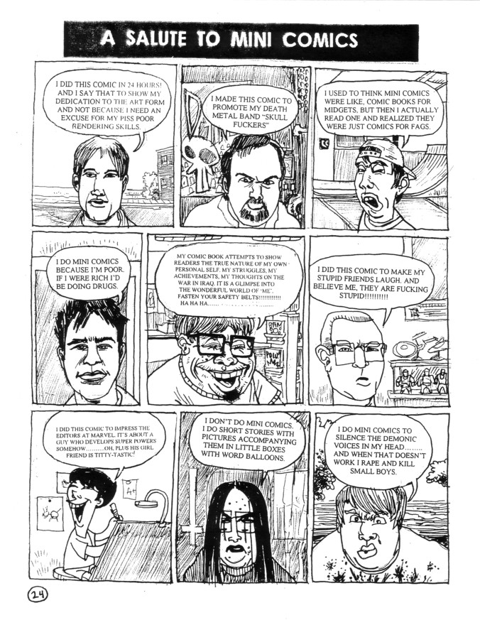 Remember, way back in the review to #5, when I told you people to buy his books now before he got all rich and famous? Well, #1-5 are now sold out, so you missed your chance! This is new though, so I imagine you can still get a copy. What’s new? Well, any hint of “longer stories” is out the window. One story is five pages long (Twisted Soul of a Sadboy), one is three pages (Christianity is Retarded), the rest are all either a page long or done by somebody else, and by “somebody else” I mean Jenny Gonzales. If you don’t find AIDS, aborted fetuses and misplaced homophobia at least slightly funny, you should probably take your business elsewhere. If you do have a sense of humor, stories in here include an introspective frat boy, Classy McSnoots, Teenage Mutant Ninja Lesbians, Booblocker 2000, Monster Needs Sex, United States of Abortion, and the hilarity that is Santorum. There are also more newspaper style strips than you can shake your angry self-righteous fist at, but he has completely won me over on this front. Oh right, he’s one of those people who’s always looking for criticism. Let’s see… um, the strip about the Merchandise Man was kind of dumb. Other than that, it looks to me like he’s worked the bugs out. I just flipped through this and couldn’t find much of anything to bitch about. He’s even fixed the lettering! It’s still only $2 and it looks like he’s getting his big break in publishing a book called Centerfield. It better be published by one of the “big” independent publishers, because he’s ready to get some actual cash for this…