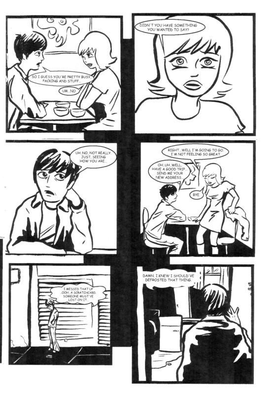 It’s a flip book, you see, so instead of picking a cover I just went with both of them. One half is the story of a boy, the other half is the story of a girl, and they’re dating. The problem is that the girl is moving away, the boy has made some mistakes in the relationship and he’s not sure if saying “sorry” is still going to cut it. It’s tiny, as they both get around six pages to tell their side of things, and it’s not complete until you read both halves. That’s obvious, I know, but it’s told in a way that’s almost completely one-sided for each person, so reading the first half of the story (which is whichever one you want it to be, I guess) only makes a little bit of sense. It’s a neat concept once you read the whole thing, but kind of annoying at the moment that you’re only halfway through. Contact info is up there, again with the pence, let’s call it $1.50 because of the smallness…