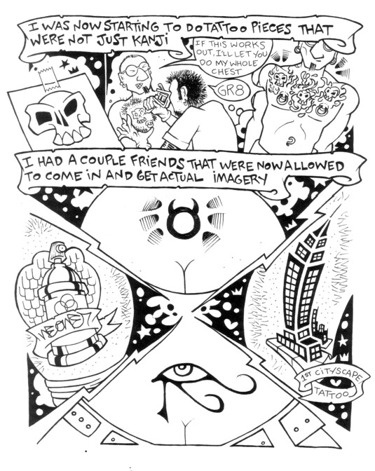 This is one series that I had given up on completely. Don’t get me wrong, I thoroughly enjoyed it and had no problems with quality, it’s just that the last issue came out 4 years ago, and this was only ever meant to be the story of his first year as a tattoo apprentice. Well, I knew what this was as soon as I saw the envelope in the mail, and good for him for at least seeing this through. This finishes off the tale of his first year, avoiding any kind of a happy ending and instead going with reality. Adam gradually starts doing more and more complex tattoos, under the “watchful” eyes of the two store owners. The trouble is that one of them is too watchful (often jumping in and taking over at the first sign of trouble but rarely teaching anything in the process) while the other merely shrugs when things go wrong but it happy to tell Adam after the fact that he knew exactly how to fix the problem all along. Adam was also making a pittance this whole time, starting with %20 of the sale, eventually moving up to %30 and getting to %40 by the end of the year. There was also a creative breakup between the owners, as one of them gave up ownership and became substantially less helpful. Still, at the end of all this Adam found himself the low man on the totem pole, without enough experience to be anything but last in line when new customers came in. Adam finished up with things exactly as they were at that point in his life: bleak. Luckily for the reader (in a way), this took 10 years to put out and Adam is nice enough to put all sorts of updates in the back of the book. We hear from both of the previous store owners, we learn that Adam is doing quite well these days (at least in part due to exposure from the comics), and we get to see a few amazing examples of what is now his “thing”: cityscape tattoos of various sizes. It looks like this is it for Adam as far as comics goes, as the man works with his hands all day long so it takes him forever to put one of these issues out. It’s damned shame, as he’s pretty good at this stuff, but I can see where he’d want to go with his first passion. I still think this is more than good enough for a graphic novel collection, possibly with a progression of his tattoos over the years if possible to showcase his improving skills. The first two issues of this are still available in my online store, and I’ll throw in a copy of #3 with the first person who orders the pair, as Adam sent along an extra copy of #3 with this one for some reason. $3.95