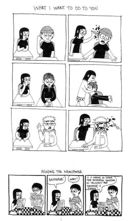 Would you believe there’s not a single fart joke in here? Three cheers for that, although there are plenty of poop jokes in here. None of that makes the slightest bit of difference though, for one simple reason: this comic is funny. Seriously, consistently, laugh-out-loud (to drag out the tired cliche) funny. Will-I-get-in-trouble-if-I-sample-every-page funny. It’s mostly just online because Julia’s too poor to print too many of these things, which is a damned shame, and a good reason for you to go that website up there and order comics. What, you want to read about the actual comic first? OK. In here are strips about career options, being small, how to get a boyfriend, drinking, first swear word, Squitches, Jesus camp, insomnia, and babies vs. abortions. And that’s just the first half of the book. She seems to have completely avoided the strip trap of doing every one with the same damned number of panels and set-up, these range from three panels to the whole page. And did I mention that it’s hilarious? I really was laughing pretty much all the way through, which is a rare and welcome thing. Sure, this is the sampler and maybe all of her other comics suck, but looking at some of the examples on the website I really doubt that this is true. She’s also trying to save up money to go to James Sturm’s Center for Cartoon Studies, but screw that. So she could maybe learn to refine her drawing skills, but so what? She already knows how to tell a good story, what more do you need to know? $2