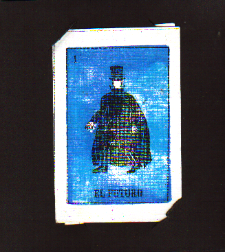 Front, back, and then the actual picture. You can see where the card was in the corners of the picture. Everybody got it? OK. The actual story is about a little boy, seen above and a girl, and a mysterious figure called Liberacion who offers them the future for a song. It’s a gorgeous book and it looks like he has plans for a lot more, although I don’t see how it could ever be done in a way where more than a few dozen people could buy it. But what do I know about stuff like this? It’s unique and worth a look, so send him some money at: P.O. Box 301 Athens, GA 30603-0301. Or just e-mail him, whatever floats your boat…