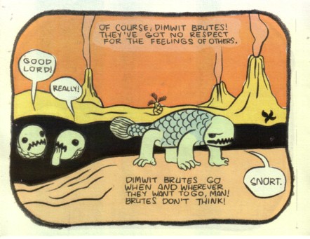 Well, you can see for yourself how awesome that cover is, so I shouldn’t have to do too much “selling”. This is meant to be a little public service announcement, or, as it says on the back, “These motivational tracts were produced to be placed in conspicuous areas where public urination may occur”. It’s short, but it’s in full color and gorgeous, with even the background characters being interesting. And if you have some money to throw around, you could do a lot worse than to buy a bunch of these and leave them at rest stops on your next road trip. $1