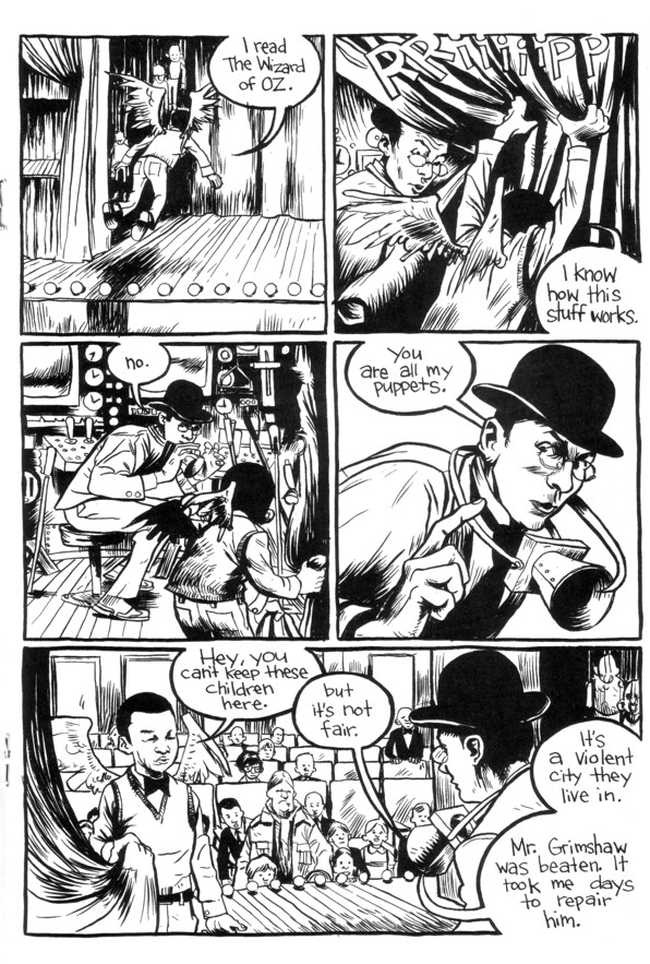 This issue just goes to show that there’s no way to randomly pick the perfect issue in a store by somebody that you know nothing about. I think all 5 issues of this were available at a remarkable little comic store I went to in Yellow Springs OH (Dark Star Books) but I went with the latest issue to see how good he is right now, knowing full well that I might be lost in the story. Well, I’m going to take this as a stand-alone issue, even though it seems fairly obvious that there was some buildup to a lot of this. It’s a story about a puppeteer who wants to keep all the children of a dangerous city safe by forcing them to watch his show. Then there’s a boy with wings, a giant, a floating fish and a robot. Yes, it’s confusing, but it all holds together even without a back story. Visit his website, there are plenty of samples there of all 5 issues and links to order them. I think he’s also been in some Meathaus anthologies, I could swear that I’ve seen his artwork before…