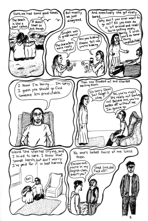 I’m going out on a limb a little bit with this one, so if anybody knows that this info is wrong, get in touch with me and I’ll fix it. Anyway, this is a good little book. It was done about 7 years ago, hence the confusion about her current whereabouts. It’s a big book for a mini, but there are only three stories in it. There’s a short one about a miniature village and two stories about different people either in love or trying to fall in love. I thought it was a bit dopey at first, honestly, until I realized that I was completely sucked into the characters and what was happening to them. Lots of things are talked about but nothing is examined all that deeply here, it’s more about the stories themselves than analyzing the motives of the characters. In the second story about Spring, for example, the main female character starts seeing a boy while still dating her long distance, long term boyfriend without much thought given to the reasons behind it. I’m not saying that this is a bad thing, as the book was still thoroughly entertaining, it’s just a surface view of the characters instead of looking around inside. If you’d like to get this book I’m pretty sure that you can send her $2 or so at: P.O. Box 170143, San Francisco, CA 94117. Or you can e-mail her through this website to see what else she has around, I saw something there called Northbound that I’d never seen before…