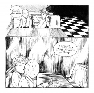 You all know the drill on these I Know Joe Kimpel anthologies by now, right? 4 artists giving their take on whatever the title of that anthology happens to be? OK, just checking, don’t get all offended or anything. This one is about the nebulous concept of the future, so these four are able to take the concept and veer off into wild directions. Jennifer Tong starts off with the highlight of the issue (i.e. the one I was sure that I was following correctly), dealing with two people who are chatting online, having holographic interactions, before finally deciding to meet in person. I love this one because if you took away the bells and whistles (holograms, a device to let them fly) the personal side of it happens every day. Jason Overby is up next with an illustrated poem about needing to keep moving to stave off death, or at least that’s what I took away from it. Emily Wieja then has the most interpretive piece of the bunch, dealing with pollution, a bird eating a worm, an eagle and… aw hell, I don’t know. I’m still trying to piece that one together. To me it was a bunch of pretty pictures that didn’t add up to anything resembling the story title (“Mirror”), but sometimes I get stuck in my literalist ways. Finally there’s a silent piece by Jose Luis Olivares in which a tiny man clothed only in grapes tries to give a pretty flower away after witnessing the true horror of the world and, after a series of hardships, finally meets a woman that’s about 50% boob. Hey, I didn’t draw her, and maybe I only noticed because I’m a creep, but they were pretty hard to miss. Also pretty harmless, as they were on a tiny adorable cutout woman. Oh, and I should also point out that the actual cover is a bit shinier than the sampled image, in case you like shimmering gold on your comics. All told I’d say they have better anthologies available, but there’s enough good stuff in here to make it worth a look. $7