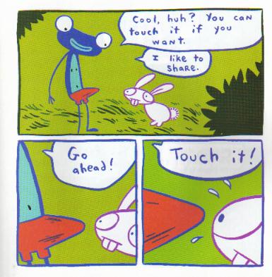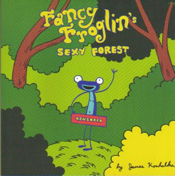 If you’ve ever wanted to see James Kochalka naked, buy this book! Seriously, I’m not going to scan the picture because I’m pretty sure it’s only for paying customers, but he’s totally nude, dude. As for this book, maybe I’m just looking for more mature stuff from James after his incredible work with his sketchbook diaries, but this whole thing is as childish and silly as it could be. You know, maybe you should try getting drunk before reading. I think that would help the humor a bunch. People who have bothered to read the rest of this page know that I’m a huge James Kochalka fan, so I’m not going to say that I hated this book. I’m simply going to to say that I didn’t like it as much as his other stuff. OK? If you’re looking for a story synopsis, I’ll do the best I can. Fancy Froglin wanders around a lot, either with a boner or trying to get his boner back, while talking to Some Bunny, Uncle Funky and Butterfly Guy. It’s $12.95, which is a pretty hefty price for a book that’s so quickly read, but you know what you’re doing when you buy a Kochalka book by now. It’s worth getting just to see the incredible coloring job that was done to this, but as far as content goes, I think he’s done better work. Contact info is scattered all over this page, you know what to do.