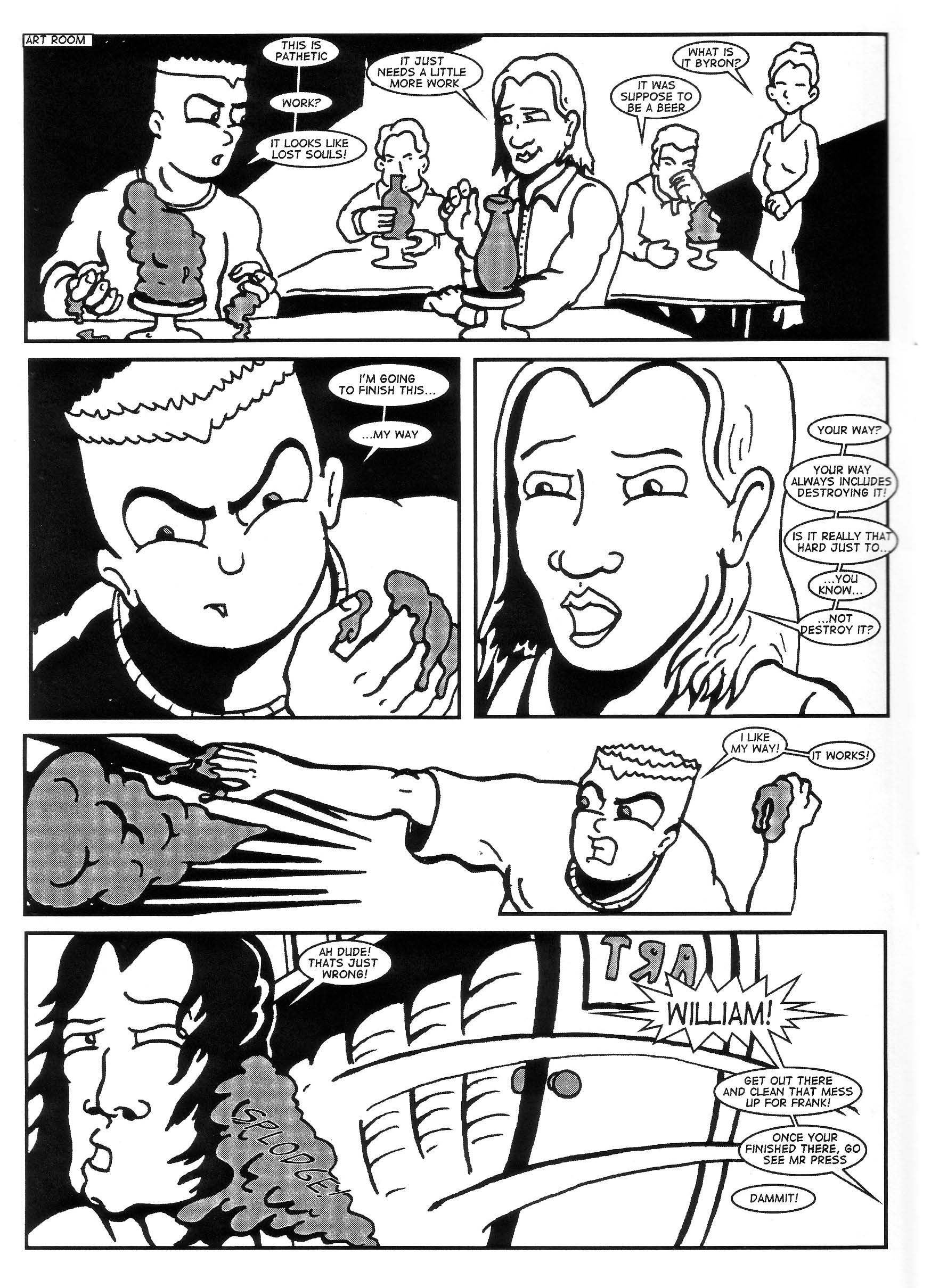 I’m torn on this one. On the one hand I would love to give a pass to the constantly wrong usage of “you’re” and “your”, “too” and “to”, but on the other hand that would make me a bit of a hypocrite. Ah well, so I’ll be a hypocrite. After all, the series is over with (this came out in 2006 and Hayden sent along the whole second series), so any advice I give about such things would be rather pointless. OK, how about this: Hayden, if you’re planning another series, please pass it too an English major or two to make sure that all the easy errors are fixed. There, problem solved! I still wish there was some kind of detailed series recap so I would know exactly what happened in the first series, but I’m hoping this will catch me up as I go along. Anyway, in this issue two mysterious figures are terrorizing the students, Billy gets in trouble at school, Billy meets up with Deadus (I’m very curious about their history, and if you were wondering, contrary to appearances on that cover, he does NOT give Deadus a noogie that I could see), Billy punches his evil twin, another student seems to be making this get all evil, and things end on a confusing cliffhanger. It’s a little odd that both issues so far have needed an afterword to explain what happened to people in the comic, as that sort of thing should make sense in the context of the comic itself. So far it seems like this series has problems, but the humor is infectious and I’m increasingly curious to see if this ends up making any sense. Worth a look, I think, but so far it’s mostly my love for bizarre humor and apocalyptic plots that are making me say that. $3.50