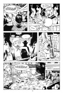Just to make it clear, Brittney drew and co-wrote the book, with Anna being the other co-writer. As I usually put the writer first in the title, just wanted to make sure everybody understood that. So hey, Brittney is branching out into the world of graphic novels! I swear, if it wasn’t for the fine people at the Xeric Foundation, I shudder to think of the state of the small press comics world. Good thing that those TMNT guys have a genuine interest in promoting the medium. Anyway, this is the story of Francis Sharp, back in the days when a kid had to listen to the radio for his tales of mystery and intrigue. Francis is so caught up in the grips of these stories that he’s worrying his parents, and when he fails at watching the cattle it turns out to be the last straw and they have to sell the radio. A friend comes over to listen to the show, they end up playing outside because of the lack of a radio, and then chase a mysterious, half-seen creature through the forest. His friend gets caught on something, Francis forges ahead, and the next thing you know… well, look at the sample image. I love how this child who lives mostly in his own head, with a clear love for fantasy and odd creatures, turns into a shrieking machine when confronted with something that is actually fantastic. He spends the night hiding under a stoop until he is discovered in the morning by one of the inhabitants of this odd town, and it quickly becomes apparent that he’s not from around those parts. This first volume seems to be setting things up for future adventures, as we’re mostly dealing with Jack, the split between his rich fantasy life and his dreary home life, and the first early hints of what exactly the new town is all about. Oh, and the slight problem that there doesn’t seem to be a way for Francis to get home. I love the idea of setting it in a time where wonder was still an option, before technology could be used as the answer to a number of mysteries. I hope the two of them have big plans for this, and I hope that they can scrounge up the money to keep putting the chapters out in such gorgeous packages, as I was thoroughly taken in by this story. Francis freaking out at all the “monsters” was a perfect touch, as he may have a vivid imagination, but a child being exposed to that sort of thing probably would freak out a bit. I think this qualifies as “all ages” too, if you happen to have a small child who appreciates good adventure stories, but there’s also plenty here to keep an adult interested. $10