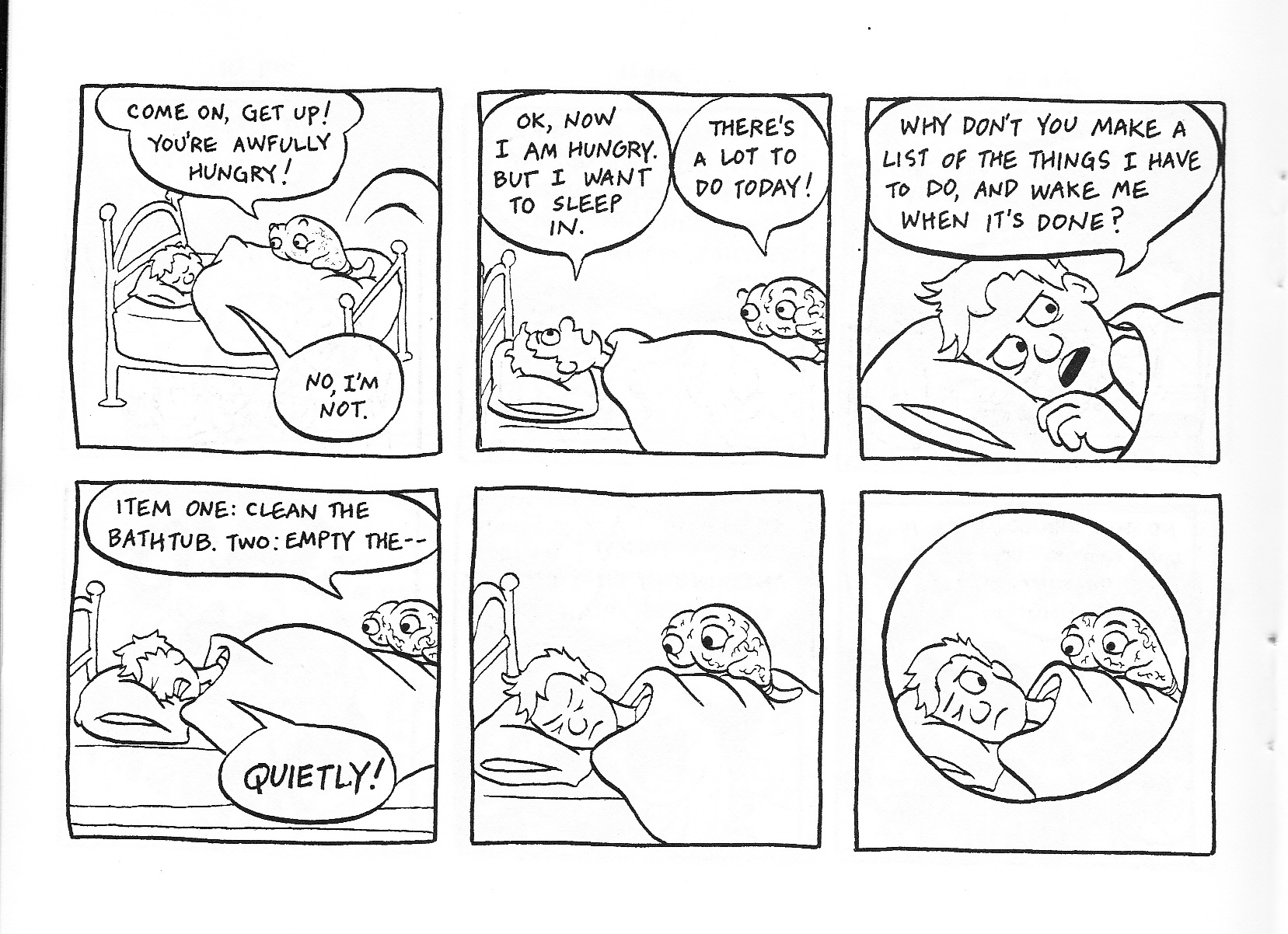 Jason Viola seems to be on a quest to convince me to stop hating the weekly (or, Jeebus forbid, daily) comics. Granted, these comics weren’t produced for a weekly magazine or (as far as I can tell) on any kind of a timed basis. So no, I have no idea if he could physically pull off a weekly comic. There’s also the tiny fact that weekly comic artists seem to be a dying breed, so the guy almost certainly couldn’t make a living at it. Still, his comics have convinced me that he’d be perfect for it, and if I ever get this time machine working I’d be happy to send him back a couple of decades where he could have made a great living by being genuinely funny on a regular basis. Jason is the man responsible for Herman the Manatee (which he says he’s wrapping up) and Amy Amoeba, so yeah, he’s funny. Pretty much my only concern when getting a new book from somebody I already know is funny is “OK, so are they going serious (and, if so, can they pull it off)” or “can they still be funny with a new title?” That second thought is rarely a real concern, but it pops into this cynical brain of mine anyway. No worries at all for this comic. As you can tell from that cover, it’s all about Jay and his brain. I’m not sure if this is 100% autobiographical stuff, but Jason mentions on his website that it’s the most personal comic he’s made yet. Anyway, these are generally six panel strips, often with the last panel being some kind of a laugh line or an “oh you!” type finisher. And there isn’t a shitty one in the bunch, except for maybe the Twitter comic, which I didn’t understand enough to comment on either way. Topics in here (often in a roundabout way) are insomnia, guilt, going blank at the worst moments, being unable to stop thinking during sex, only having the good story ideas at inopportune times, drugs, hoarding, and thinking of himself as a fraud. That’s the first half of the book anyway, the rest is up to you. Your best bet is to just buy a bunch of his books, as he currently has the four issues of Herman the Manatee available for $10 total. $3