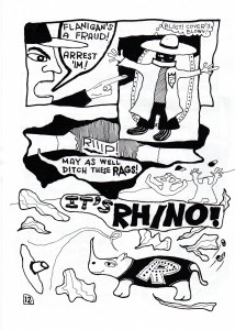I’ll sometimes warn you reader folks not to judge a book by its cover. Obvious advice, I know, and not exactly insightful, but people sometimes ignore it anyway. Take, for example, this cover. There’s so much going on here (zombie shadow? man on a motorcycle riding to the rescue? barbed wire? bullseye?) that I was genuinely curious to see what happened inside, but I can see some people maybe passing this by if they saw it in a store. One look at that sample below should change your mind. Granted, this is a bit late in the story and it’s possible that I shouldn’t give away who was really in that special agent suit, but it’s so thoroughly ridiculous that I just couldn’t help it. And no, I am not laughing AT this. I think it may just be brilliant, but even if it isn’t Frank still gets serious points for originality. The story may wander just a bit, or maybe that’s just because I haven’t read the previous issues and don’t know the whole story. This is about a team of a monkey and a rhino who are trying to deliver medicine to some sick baby possums. Really, I could stop right there, but this kind of analysis is why you guys pay the big (imaginary) bucks, right? While this is going on there’s a scientist with a crisis of conscience who is trying to smuggle some designs for a delightfully vague doomsday device out of the country before they can be used. From there we get the backstory of this scientist and how he came to be the hero and we see the monkey and the rhino trying to save the possums. I don’t want to say much more, but I will say that “Use my back as a ramp! It’s the only way!” was a thing of beauty. The art is maybe a bit dicey at times, but kudos to Frank for getting to #5 in his series, not to mention the complete lack of spelling errors. That’s more rare than you might think, but it’s always welcome. You can get a copy of this for $1 and, if that’s too rich for your blood, you can always check some samples at his site first. $1