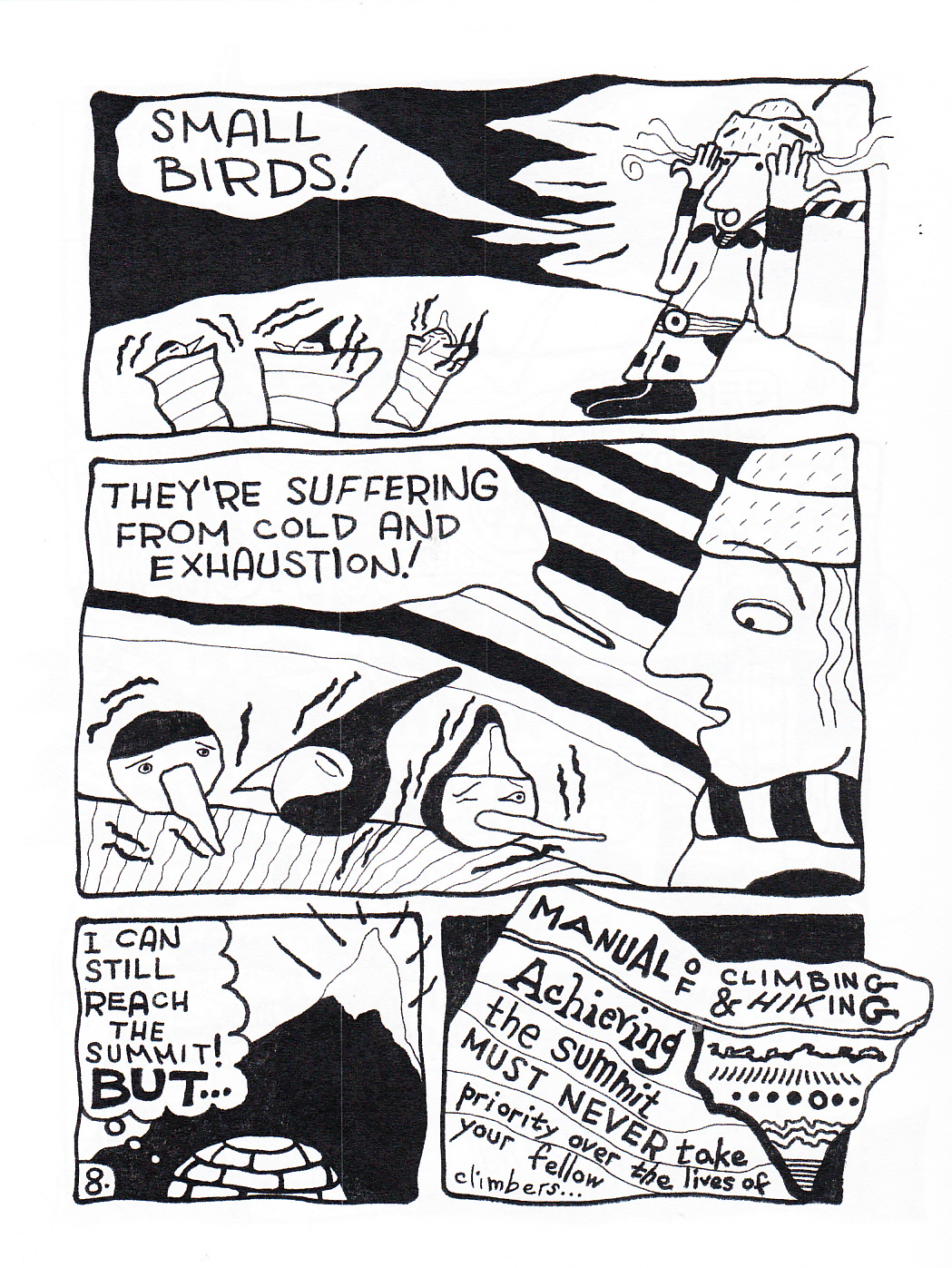 Is two issues enough for a pattern? Because if it is then it’s safe to conclude that this comic has nothing to do with stars and only very little to do with pilots. Unless maybe either the monkey or the rhino (see the last review for this guy if you’re confused) is a licensed pilot, that is. Anyway, this one starts off with a musical genius who makes one mistake in his performance. The papers go crazy because of this error, so the musician finally decides that he has to get away from all the negativity and do something new. He finds a mountain that has never been successfully scaled and makes his way up, but comes across some small and starving birds. He decides to save them and give up his quest for personal glory, but the mountain remains treacherous and he still has to make it down alive. Oh, and the monkey and rhino from the last issue also play a very small but crucial role in things. This one lacked the sheer insanity that was #5 of this series and instead went with something like 85% insanity. That’s more than enough for me, and this comic was a lot of fun, even if page 14 did feature a ridiculously out of proportion yeti. Pretty sure this is also still $1, and the entire comic is up at Frank’s website at the moment if you wanted to read it for yourself. Of course, it’s better to buy it, so maybe just read a few pages to know that you either will or won’t like it.