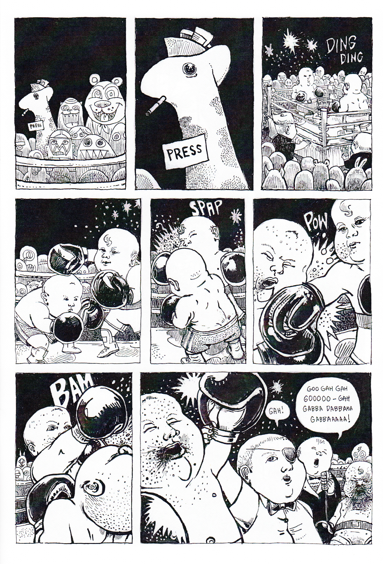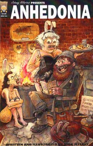 It’s been a couple of years since I’ve seen a comic from Nick (or is that one year? Ah, who can tell with linear time), and this one is full of all sorts of short pieces. But there’s a larger theme at work, so there’s that. I should point out early on that Nick included two recent rejection letters from publishers for his comic in this issue, and the man has been around for ages, so if you haven’t liked his past work there’s a good chance that you won’t care for this one. Granted, he’s done a wide range of stuff over the last 5 years, but this one is back to the basics: gore, violence, poop, fighting babies, those sorts of things. The story that runs through the smaller pieces is about a man who’s trying to sell “make the giggles,” which I can’t really explain adequately so I’m not even going to try. The salesman becomes increasingly desperate and sad as people fail to buy his product, until he is suddenly replaced by another informercial, which is the way of things these days. Other stories include a notably grim tale about a dog that’s trapped in the ice and an attempted rescue, a creepy albino after a football game, fighting babies (what, you thought I was kidding?), dog violence, how Kirk Cameron gets his kids to listen to him, being drunk and racist on a bus, being a racist duck (with a twist ending), a number of three panel strips all crammed into one page, and space boobs. I’ll admit that a few pieces seemed to just drift off without accomplishing all that much (the story about the space boobs and albino football player), but overall it was still a pile of mostly funny comics. Which were also incredibly offensive to most sentient humans, just in case you were offended by… oh, lots of different things. $3.50