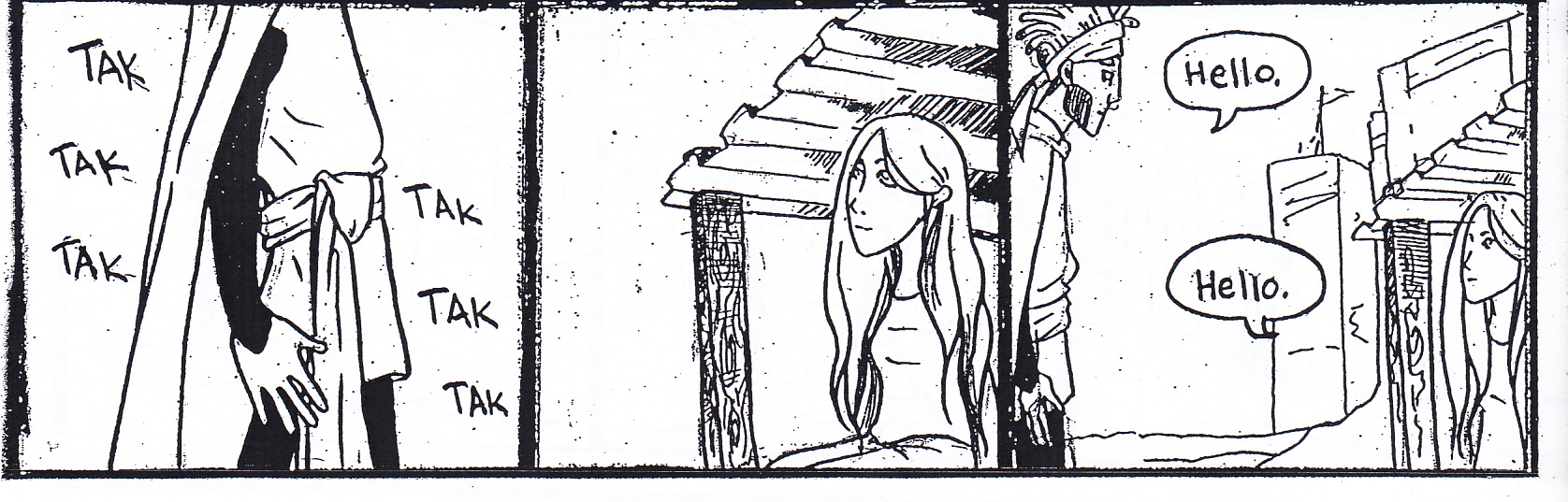 OK, this is a really clever comic. It’s another one from the Lutefisk Sushi E box, and as such it’s damned short, but it didn’t need to be long to make its point. You know all of those stories involving some lone hero on a quest of some sort, how all we usually get to see is a straight line from A to B? This line can be long (like the Lord of the Rings trilogy), but it’s still going clearly from A to B. This comic takes the hero from one of those quests and shows what happens when he goes off track a little bit. He’s still completely self-assured, but his asking a question about “the one I am looking for” to a random stranger makes him seem a little crazy, as it so obviously would. There may or may not be a larger story attached to this and, oddly, for once I don’t care. This is a perfect little moment all by itself, and another fine example of the kind of comic that fits perfectly into a large grab bag of mini comics like this.