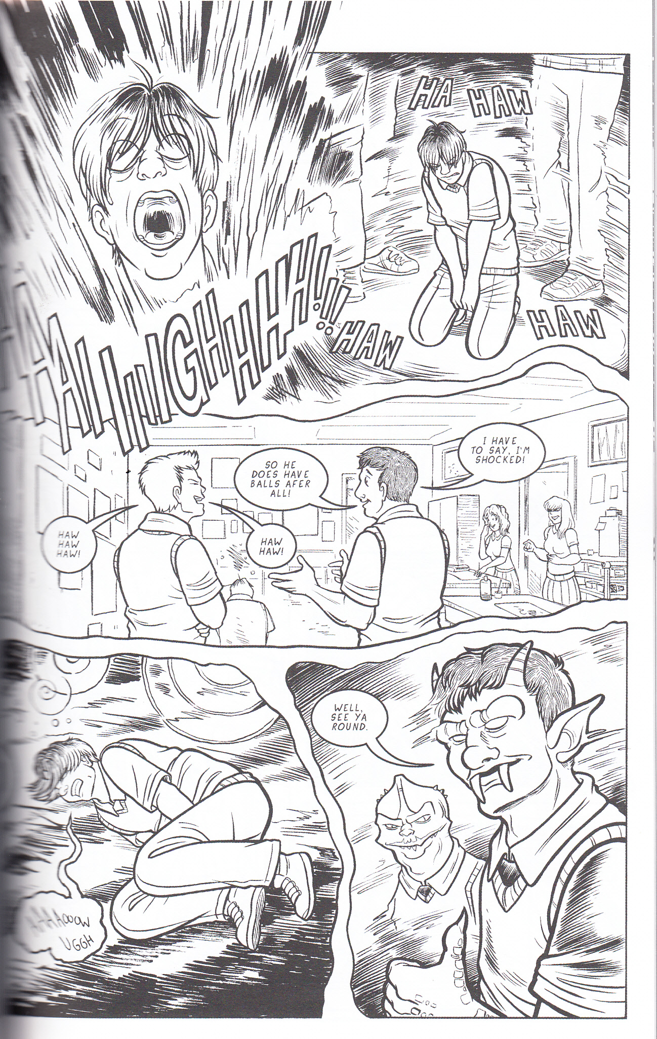 Somewhere out there is a human with no attention span who started reading this and gave up on it because they assumed that it would end up being another in a long line of graphic novels about a loser trying to get together with the girl of his dreams in high school. Which would be their loss, as this book has only the barest relationship to those very early pages. This is instead a story of madness, the attempts to deal with it and/or avoid it, and trying to come up with a good definition for mental illness. Jeremy is a kid in high school with few friends, but overall he’s made fun of and has very little luck with the ladies. Well, one lady in particular, who happens to be dating one of his few friends. Jeremy escapes a bit into his dreams and art, but these dreams gradually permeate his waking life until he finally ends up smashing a bunch of glass beakers during his chemistry class. It’s always best if you have your freak-out in high school behind closed doors, but Jeremy does not have that luxury, and he ends up getting sent to a facility where they try to get him back to normal. This is where I get into tricky territory in regards to potential spoilers, so I’ll just say that the rest of the graphic novel deals with his conversations with his demons (literally), the ups and downs of trying to regulate his moods and, above all, the world from his perspective. This is where the book really shines, as we’re immersed in his world and his view of what’s happening to him, along with his own internal logic about his conversations with God and his destiny. He also has to complete this destiny before he dies, because “they” have given him cancer and bugs crawling on his brain. It’s some genuinely terrifying and unnerving stuff, and the arc of it is beautifully done. This is damned near required reading for anybody who has had a friend/relative/acquaintance suffer through mental illness, as you see exactly what Jeremy was going through every step of the way. For a first graphic novel it’s damned near perfect, and I’m intrigued to see what else Elaine comes up with. This was published with help from the Xeric Grant, which is now gone, so I’m curious/nervous to see what replaces it. What, aren’t there any rich and famous people who want to help out with this sort of thing? Didn’t I see a quote from Jenna Fischer (from The Office) on an old Renee French graphic novel? Somebody who knows her should see if she wants to help out with a grant like this, as she definitely has a pile of money from that show. But I’ve wandered very far from the subject. Check out this book, that’s what I was getting at before I derailed myself. It should not be missed.