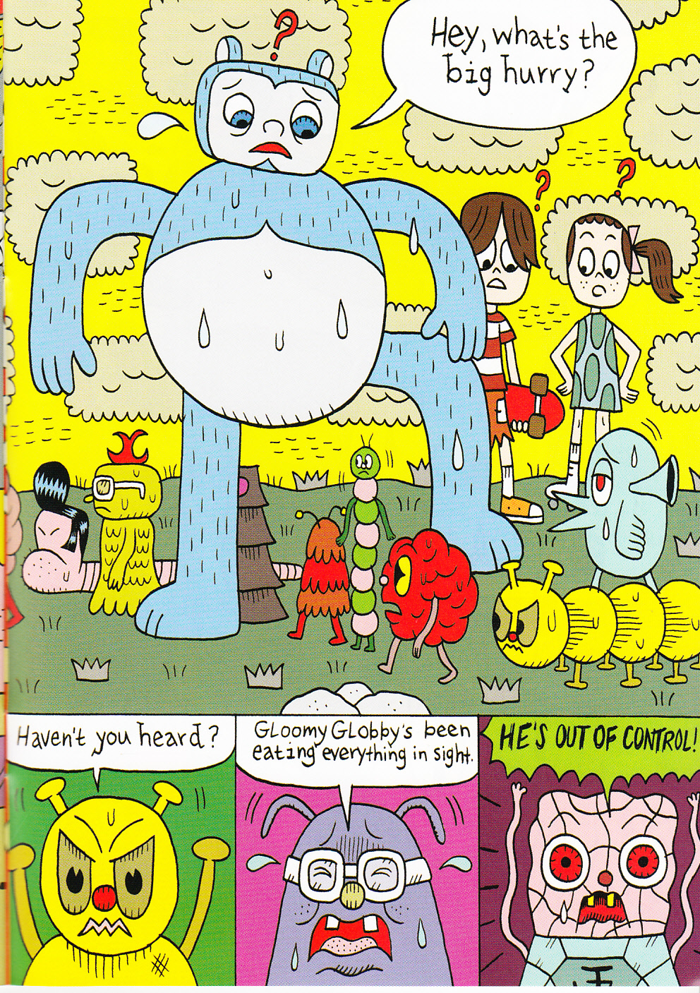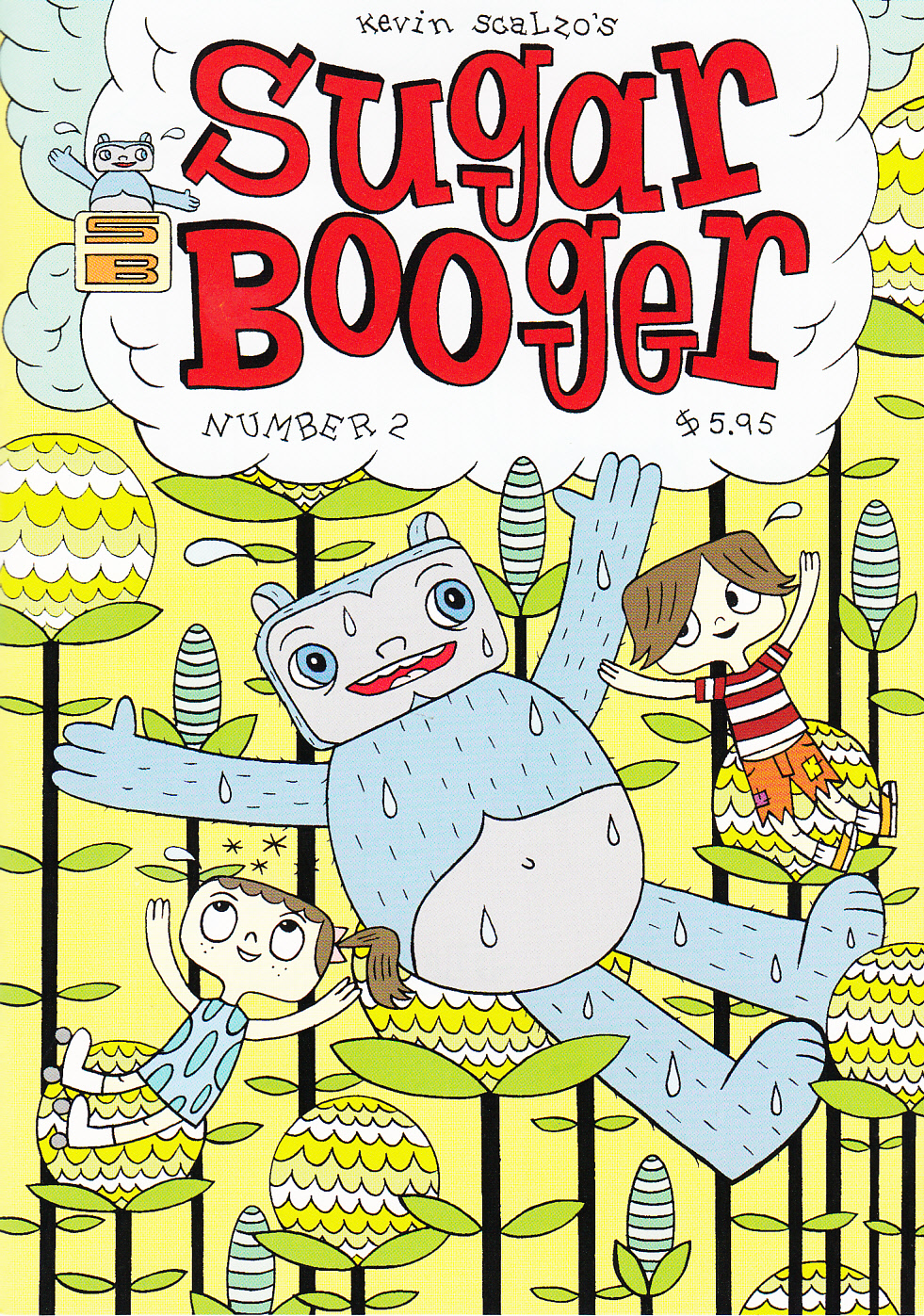 The horrific but somehow kid-friendly adventures of Sugar Booger continue! In case you missed the last issue, the premise is simple enough: Sugar Booger eats sweets and pours out a better version of the candy through his nostrils. At least I assume that it’s a better version, as it doesn’t make much sense otherwise. Hah, there I go, trying to make sense of this idea. Anyway, this issue starts off with Sugar (if you’re OK with me calling him by his first (?) name) realizing that all of the candy that he’s made is causing a problem, as it’s not possible for the residents of this land to eat it as quickly as he makes it. Luckily a Gloomy Globby monster comes along and is ravenously hungry, so it looks like both of their problems will be solved. But Sugar isn’t counting on the hunger of this monster being insatiable, so steps must be taken to reign in the problem. The art in this is ridiculously joyous, but the hints of the horror of this creature do seep through here and there. Or maybe it’s just me, who knows? But in a world where Adventure Time can take over cartoons, I see no reason why this couldn’t be a fantastic cartoon in its own right. Assuming Kevin would even want to go in that direction, that is. His use of color is also damned near unparalleled, as so many small press color comics are content to just throw in a few colors and call it a day. Kevin uses every color of the rainbow, often not in places that you would not expect, and the results are utterly unique. And don’t even get me started on the various smaller creatures that inhabit this land, because those walking brains that also serve as bouncy shoes are the tip of the iceberg. Get this comic, is what I’m trying to say. I can say this and have it be literally true: you’ve never seen anything like it. $5.95