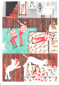 If there’s a better use for dogshit, I’ve certainly never seen it. Getting ahead of myself a bit with this review, but that’s definitely the standout image of this mini comic. This is the story of a young woman going about an average (probably) day in her life. It’s wordless and starts off with this woman waking up to what appears to be a strange man. She does everything possible to avoid waking him up, anyway, which certainly implies “stranger” to me. From there we see her triumphant escape and her journey home to a waiting dog that is clearly overjoyed to see her, as is the custom of dogs with all returning owners, no matter how long they’ve been away. The rest of her day consists of her taking a shower, going through a bunch of outfits before finally picking one out, taking her dog on a walk (this is where the dog shit bit comes in, but I’m not going to spoil the context) and finally stopping to get some liquor. The art is gorgeous throughout and Tara really nails the most important aspect of a silent comic: emotive facial expressions. This is fantastic tale of a day in the life, warts and all.
