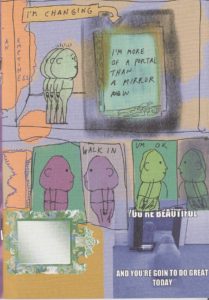 As always, the temptation with a review for a mini kus book is to just post the snippet of text on the back of the comic and call it a day. That’s usually more succinct than what I do here, and often more descriptive. But what’s the fun in that? This is the story of an unsettled man who starts off his tale by talking about how he feels the most like himself while he’s traveling. From there we see how miserable he is at home, how he goes about an average day, and how he always feels like he’s waiting for something to happen, but has no idea what that might be. After a fair amount of self reflection, our hero discovers a talking mirror in his apartment. This mirror, at the very least, offers a change of pace from what our hero is used to, so eventually he accepts it as an agent of change and steps inside. Oh, didn’t I mention that the mirror was also a portal? Anyway, I’m getting into spoiler territory if I go even a little bit further, so I’ll leave the rest of it up to you. If you’re thinking “I’ve read dozens of ‘the author is existentially bored/unsettled stories'” and are wondering if there’s anything unique that this one brings to the table, yes, there is! I just can’t tell you here. It’s all about perspective and trying to learn the right lessons from the greats who came before. $6