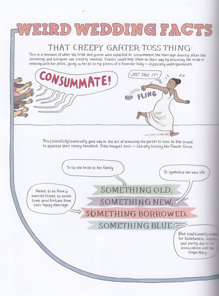 I feel the need to start this review off with a disclaimer or two: I’ve never been engaged (meaning I’ve never been all that close to getting married), I have serious concerns about the whole concept of monogamous marriage and I’ve had a cold for the last couple of days, meaning that I’m feverish and mildly delirious. The perfect conditions to write a review! This is the story of Lucy’s relationship, the bizarre path taken to a proposal, and every little thing that goes into planning a wedding. Lucy also has the same inherent mistrust of the wedding process as I do (if anything, her concerns dwarf mine), meaning that she was examining every aspect of it as it came up and decided, bit by bit, which aspects she wanted to keep, which she wanted to change and which things to make entirely her own. If you’re planning on getting married any time soon (but not too soon, or your plans will already be completely locked in), I can’t recommend this book enough. Lucy lays out several areas where she was able to shave costs off the ceremony. Granted, these might now all be possible for you if you’re not surrounded by amazing artist friends and family, but a few of these steps are universally applicable. As for the graphic novel itself, the sheer amount of information I learned here was staggering. I knew that getting a wedding dress was arduous, but I had no idea the scope of it, or that it often took 6 months (!!!) after finding the perfect dress to have it in your hands. The number of steps involved, the number of people involved, the impossibility of keeping everyone happy… this book did more than anything else I’ve read to explain why it takes about a year to actually plan a wedding. And as for the various wedding traditions? Lucy seemingly researched all of them, and the sample image below shows just a few of the creepy and/or horrific origins of them. For example, that thing about it supposedly being bad luck to see your fiance on the wedding day before the wedding itself? That goes back to arranged marriages, where it was though that the sight of this stranger could cause the fiance to flee. So… not much use in modern times, right? There was even a fairly adorable scene where Lucy and her fiance intentionally woke up together on the wedding day, because both knew they’d be too busy to see each other for most of the day. As there’s so much here I feel like I could go on forever, but I’ll wrap this up by saying it also works really well as a sustained narrative, not just for the piles of piles of practical information. She’s also effortlessly funny, and this book was a good reminder that (outside of a few anthologies), this website is mostly Lucy Knisley-free. After reading this, I’ll be fixing that mistake sooner rather than later. $20