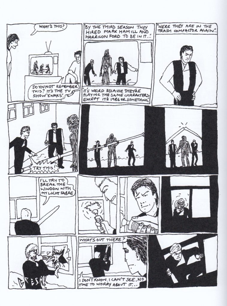 This might be a turn of phrase that I’m not supposed to use as an American, but I’m going for it anyway: this one did my head in. David’s comics can get abstract occasionally, sure. But to do an entire comic on dreams, and to have it end up as… um… dreamy as this one? It’s impressive as hell. Partially that’s because it can be tricky to tell when some of his stories end and the next one begins; he’s not a big fan of a title page indicating the start of a new story, and in this one there aren’t even page numbers to keep you grounded. It’s just stories of dreams, some bound by a loose connection, others not at all. To give you some idea of why this messed with my brain, here’s an example. One of the stories deals with an ape man who’s chasing David. He throws bananas to distract it as they climb up the side of a building, then enters the rocket ship on the roof. The ape man fires his gun at the rocket, which discharges a bullet that’s bigger than the ship. In the next panel David hears a bang, which he determines came from his kitchen. Even though he was in a rocket in the previous panel. That kind of thing happens a lot in this comic. It’s skillfully done, but occasionally unnerving. Usually this is the part where I’d tell you what these stories are about. It’s tradition, so I guess I’ll give it a shot, but be warned: this will make even less sense than usual. Stories in here deal with a giant purple naked man who’s the year 1994, running to catch a show and then dissolving literally into laughter, wordless Star Trek, trying to determine the appropriate height to fly in a dream, being in the room for a Tony Blair interview, the Star Wars actors getting stuck in an Ewok TV show, and having his spaceship overrun by giant naked men. Even that doesn’t do this issue justice, so I’ll just say that if you’ve enjoyed his previous work, you’re bound to love this too. Or possibly be very confused by it, but I think that’ll settle into love.