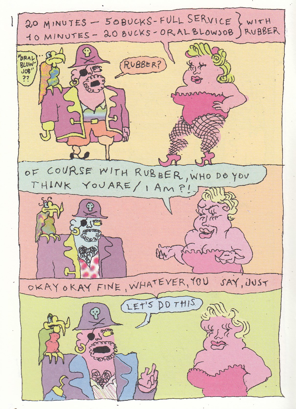 Seriously, who writes the blurbs on the backs of these mini kus books? Is it the artist every time, or do they have one genius who writes each of them? What the heck, I’ll just post the synopsis: “The pirate stands for desire. The parrot stands for opportunity. The fish stands for hope. What do you stand for?” And, when the comic is done, it even all makes sense! This is a funny and disturbing comic, but mostly just funny. A pirate and his parrot are on shore leave, and the first priority for the pirate is to find a brothel. He doesn’t have any money, but he does have a plan for how he can make this work. This leaves the parrot all by himself, and while he’s waiting a fish escapes a net and flops onto the pier. The fish wants to be put into a bucket, which confuses the parrot, as the ocean is right there. The ocean is currently uninhabitable, to do a spill of… you know what, I’d better stop right there. Each of these characters makes choices after this, and each of them has to pay for those choices in their own ways. It may be an odd thing to notice, but this book also makes excellent use of colors, maybe the best I’ve seen in a mini kus book (and that’s saying something). That parrot alone is mesmerizing, and you can see what’s happening to that pirate’s shirt in the sample image. Yep, it’s another winner from the mini kus pile! $7