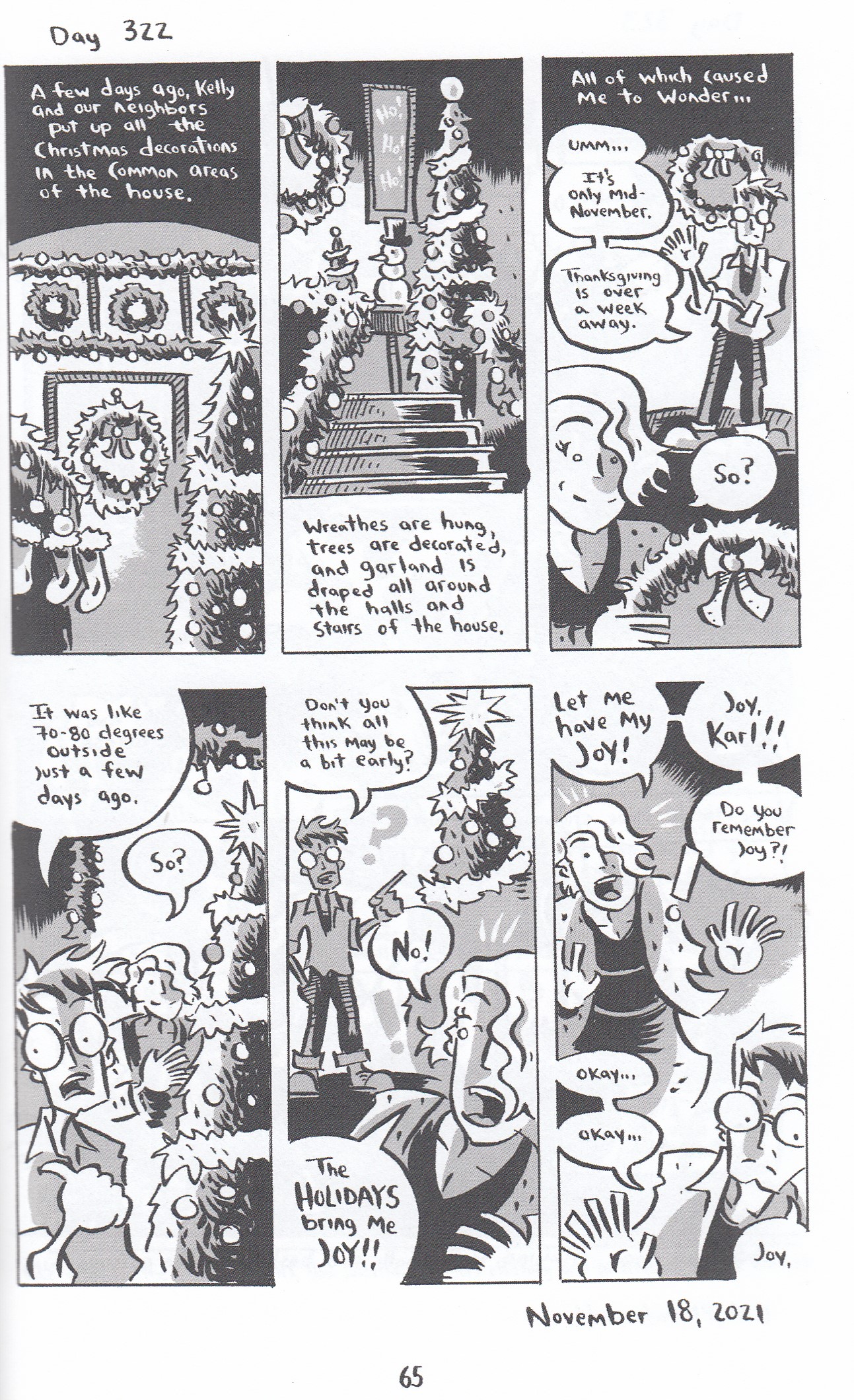 For all that I sometimes give artists grief who only put out a book every few years, it’s even trickier as a reviewer to keep up with the people who constantly produce comics. Karl was nice enough to to send along a half dozen or so books after I reviewed his fifth volume earlier this year, which then leads to the problem of what to review next. Read them all in order and talk about them? Nope, this time around I decided to review the most recent volume, with the hope of getting back to the earlier stuff at some undetermined point in the future. That never seems to work with me, but I live in hope! This collection covers October through December of 2021, and it also wraps up his second full year of daily strips. The level of detail he packs in these strips is astounding; I get that he’s able to illustrate for a living, but this is not a man who follows a simple formula for daily strips. Generally speaking, the four panels then out format is the most common for daily strips, but Karl is fine making a three or four page story out of the events of that day if that’ll make a better story. Granted, he also has a few strips that are silent sketches, but he even puts so much detail into those that I’d hardly call them an off-day. So, what’s going on in this volume? If you’re reading this in the far future you may have forgotten, but things are rough all over these days, and this volume reflects that reality. The first strips starts off with a quote from The Thin Man (the book by Dashiell Hammett) that ties into the madness of the vaccine deniers, so he’s right off to the races. There are just under 100 other strips in this book, dealing with loss (way too many of his friends passed away during this time period), hope, trying to get back to normal (i.e. being comfortable going out with friends again with not everybody wearing masks), and the introduction of a new cat in their lives, and this cat naturally ends up being the star of the show. Sure, I’m biased towards cats, but I’m also right. This feels like maybe as vague as I’ve ever been in describing a comic, but I am completely fine with that. This is a guy who’s wrapping up his second year of daily strips and frankly seems like he’s at the top of his game right now. They’re unlike most other daily strips I’ve read (the level of detail especially, but it’s also rare for a book like this to not ever feel repetitive) and I’m pretty comfortable recommending this to anybody. As to the question of which volume you should start with, that’s quite a bit tougher. Maybe pick the most eventful chunk of three months or so from your own life over 2020-2021 and see how his life was in comparison? That way if you enjoy the book you can always go back and read what came before and after it. Or just pick a number between 1 and 8 and get one at random. Give it a shot, is what I’m saying. $12
