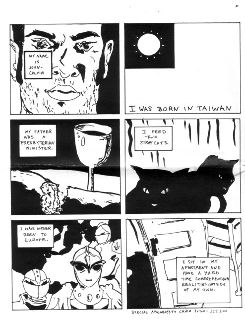 I must be starting to sound like a broken record with these tiny minis. These are, by nature, going to be short reviews, so I’ll just tell you what I know about this guy. I was talking to him at FLUKE this past weekend and mentioned that I had slept in my car the night before, and he was kind enough to offer me a place to sleep. That’s just a good person, folks. He’d never seen me before, all he knew about me was that I had come from Illinois that day and I must like comics, and there he is offering me a place to sleep. I didn’t take him up on it, mostly because I wanted to get back just tired instead of hung over and tired (I knew how the night would have gone. It was at a bar, for the love of Mike). So, send him a dollar or so, and see how you like it. Oh, should I mention what it’s about? Well, most of it is the main character reminiscing about a lost friend or love, it’s kind of hard to tell. Not bad though. Then there are a couple of one page strips about various people, the most interesting of which is sampled here. Just enough to get me curious about any longer comics he might have, basically. E-mail him to see what the has around or send him a dollar or two at P.O. Box 763 Athens, GA 30603.