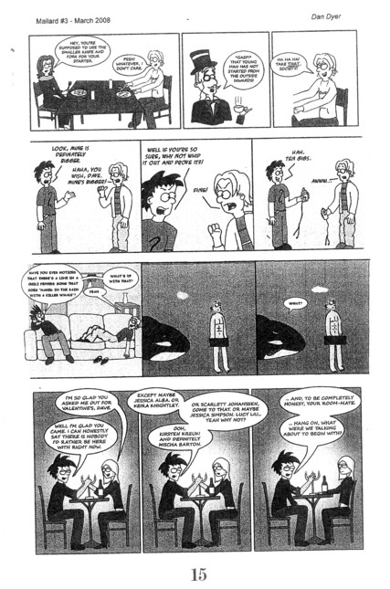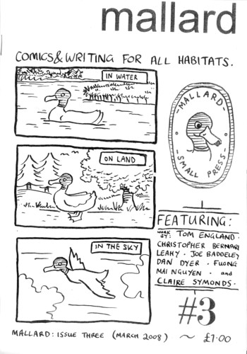 What’s the word for an anthology that, although it has its moments, ends up falling pretty squarely in the “meh” category? It’s not awful, it’s not great, but to call it mediocre seems a bit harsh. Mediocre with dashes of brilliance? Closer. Anyway, the concept is fine, with Tom England (editor and contributor) pulling together various pieces by friends and strangers. First there’s part 3 of a text story by Christopher Leahy, in which the dialogue was amusing (once it got to the dialogue) but, being part 3 of a series, was a little hard to judge from my perspective. Maybe a recap of some sort for people like me who come in late? Fuong Mai Nguyen has a couple of shorties in here, one showing her room and one showing her face throughout the years. Hard to work up much enthusiasm for either, but the drawing of her room was at least impressive in its ambition. Philip Gyres probably has the strongest piece in the book next, a simple illustrated diary of a middle aged man going about his daily life. Dan Dyer has a few three panel strips after this, notable because one of them goes all the way to 6 panels to tell a story. Notable to me anyway, because it seems like most people who pick that format feel obligated to never change it no matter the story. Mostly mildly amusing, with a few of the punch lines the sorts of things you see coming from miles away, which is the danger of being required to end on a funny. Tom England has the biggest (illustrated) piece in the book, a meandering story about philosophy and flying (and swimming) monkeys. Finally there’s Claire Simmons with a text story about a young hog who decides to eat the world and the reaction of the rest of the forest to the disturbance. Oh, and Joe Baddeley has brief panels up throughout the comic that put the “minimum” in “minimalistic”, but they’re mostly funny and a nice break while reading the text pieces. As a whole maybe I should bump this up to “pretty decent with flashes of brilliance”. Claire’s story was creepy and fascinating, Tom’s bit at least got me thinking, and Philip’s story sounds like me in ten years. Based on the currency exchange rate, this is probably around $2.