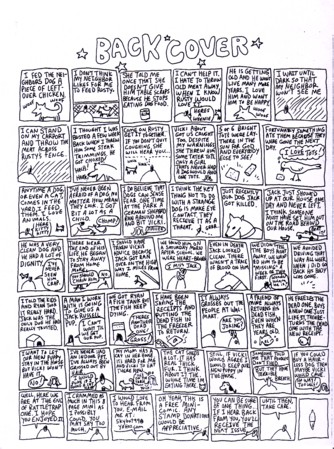 Jerry clearly doesn’t subscribe to the theory that minis need flashy covers to attract attention. He does, however, believe in cramming as much comic as humanly possible into minis, as it’s hard to get panels much smaller than this unless you want your characters to be dots (and bonus points to whichever reader gets that reference, although in this case “bonus points” means “feel free to feel good that you got the reference”). There are a measly 7 pages of story here, and it’ll take you a good 15 minutes to read them. This is mostly detailing the better part of a day in his life, as he talks about the aimlessness of his kids, figures out what to eat for dinner, worries about getting older, and chats with his wife. No particularly grand insights here, unless you count everyday observances as insights (and you could certainly make that argument), but it’s still an informative an enlightening little book. Or at least it is to somebody like me with 0 kids, as how exactly do you keep your child off the computer, or if you can’t how do you keep them away from things they probably shouldn’t be seeing? I don’t think Jerry answers any of that definitively (and who could?), but he does manage to have some honest conversations on the subject. Oh, and I almost forgot the back cover, in which he tells a completely different story about a local dog and their own dog. It’s more than a little adorable, and it’s impressive how he manages to jump in himself at the end of the strip to give his address without it seeming forced. This is listed as being the cost of a stamp, but I think sending the guy $1 is more than fair for this much comic.