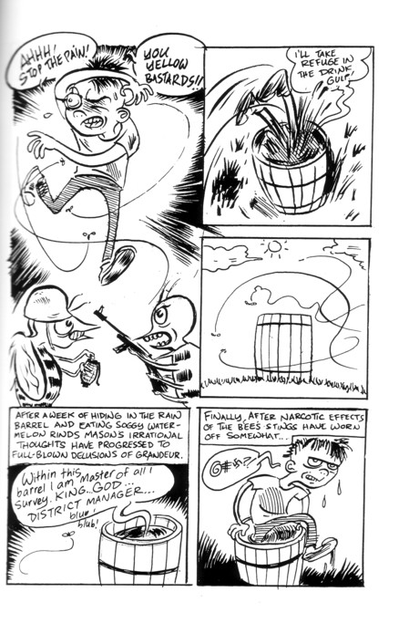 Here’s a stand alone comic from Trevor. This one is about the futile effort to try and get anywhere in the small press world, although he might not have meant it as negatively as all that. His character, Mason Rubella, is a cartoonist who’s trying to get the alternative comics convention. Along the way he’s attacked by bees, gets in a plane crash and is gnawed on by buzzards. Oh, and he also meets Foxy Brown. Oh, and did I mention that it’s funny? That usually helps a comic out, or anything else for that matter. It’s $2, and it looks like he has a website for you to check out, so you know what to do…