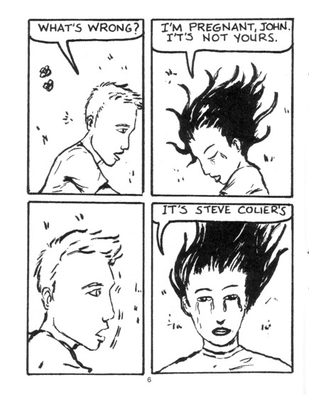 Three cheers for printing errors! OK, maybe not. I’m not sure what to say about this one because the main story (surprisingly enough, about a cheerleader) is a garbled mess. I was intrigued at the start, after I had read the parts that were in order, and then pages started repeating and suddenly it was over. I’m hoping that he has reprinted this thing, or plans to, otherwise I couldn’t recommend this to anyone. Which really sucks, because I liked his other two comics quite a bit, and I liked most of the rest of the stories in here too. One tells of a childhood story of why he has a red mark on his nose today, one is a short wordless tale about a bike, and the last is an adapted poem by W. B. Yeats. Like I said, if this has been reprinted. it looked like a good main story and it’s only a buck. If it hasn’t been reprinted, unless you’re a fan of banging your head against walls, I’d skip it. Contact info is up there for his other fantastic, coherent books….
