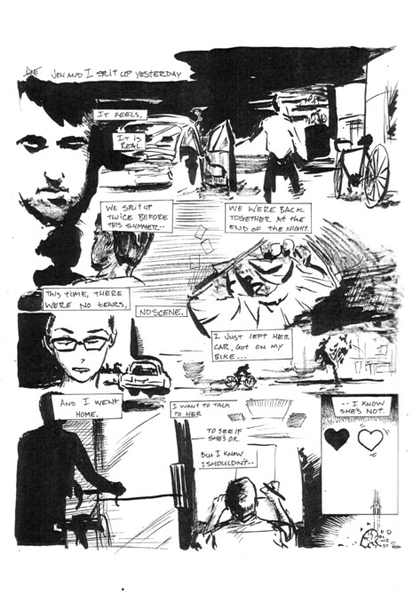 Six years or so of doing this website, and I still love the random submissions. This one from David is a bit of a mixed bag, but there’s still more then enough good stuff in here to recommend it. It starts off slowly (and a bit awkwardly, frankly) as it goes back and forth between talking about his old girlfriend, why they broke up, and then throwing in a scene where they were still dating. It picks up in the second half of the book where he has short pieces dealing with an awful job, dangerous questions, why it’s worthwhile to go to jail, an itchy monkey, the dull adventures of the invisible man, and fish thoughts. The art varies wildly throughout the book, ranging from sloppy sketchbook stuff to clean, thick black lines, and even the darkness of the copied pages varies a bit. Still, there’s plenty of interesting thinking going on here as well as a few genuinely funny pieces, which is what still qualifies to me as a good mini comic. No price tag here, but what with the color covers and all I’d guess $3.