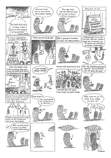 Just a note right off the bat: I’m not entirely sure that David is the editor of this book, but I do know that his publishing group seems to be the one putting this out, and he seems to be the one in charge of it. That’s a lot of assumptions to make, but if it’s wrong it’ll get its own page, OK? As I’m still making up how to review anthologies as I go, here’s a list of contributors: Helen Brealey, David Birchall, Afsoon Hayley, Malcy Duff, Reni Fahima, Zeke Clough, Nick Birchall, Mara Duchemer, Honeypears, Tim Gaze, Crippa Almqvist, Jethre Brice, Dr. Nightfield & Laima Jaunnema. Apologies to anybody whose name I got wrong, but man that type was a bear to read. Flipping through this book, it’s exactly what an anthology should be: a wide variety of visual styles. Once you dig into it in a bit more detail, while there are some excellent stories, plenty of it didn’t do a thing for me. The simple black images, the simpler black smudges: just not my thing. There are times, as well, where legible text is sacrficed for the sake of the art. That might be a better idea for the picture, but it doesn’t do me a lot of good if I can’t get across the point of the story. Still, it’s silly to disregard this whole thing just because I can’t get behind some of the stories. The strange mirror world of Malcy Duff was creepily engaging, I loved the three strips by Mara Duchomer (about work, a man who could pour coffee directly into his head, and mice getting back at a cat), and I think Nick Birchall’s Mr. Wiggins strip may have given me a seizure (I mean that in a good way). Like any anthology you have to take the good with the bad, and there’s just enough good in here to make it all worth it. Again, the price is a guess… $6!
