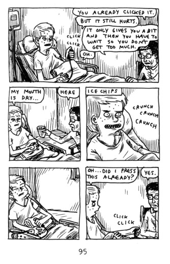 It’s odd to be saying this after the guy has already put out a half dozen or so graphic novels (and there wasn’t a terrible one in the bunch), but I think he’s finally made his masterpiece. This shouldn’t be taken in any way as a slam on any of his other projects, as they all have various things to recommend them, but this thing just stands out. This is, essentially, Jeffrey’s origin story. It details his growing up, how drawing has been with him every step of the way, and just about everything else you ever wanted to know about the man. He even has a brief FAQ at the end, answering the only real question I had (why does everything happen out of order?). The book is divided into chunks, and by the end of it I appreciated the fact that it wasn’t in exact chronological order because I knew that if there was something major left unsaid from a story, he was going to get to it further down the line. Chunks include (hey, I’d call them chapters if he did) a brief introduction into why he draws, his time as a fat kid (and what got him to start exercising), his introduction to comics (what appeared to be an issue of the X-men, around #190, and how a helpful comic store clerk steered him in the right direction), a devastatingly honest depiction of a major art critique of work (luckily he seemed to have taken away the important thing from this – critics aren’t always right), his stomach pain and learning that it was Crohn’s disease (and his painfully embarrassing depiction of everything involved with surgery and a protracted hospital stay), slowly learning to see the value in art history, his early adventures in serious intoxication, his first stab at self publishing, all his years spent working on wooden shoes, his brief journey with pot, poetry readings and hosting drunken parties, getting some direct (and necessary) advice from Chris Ware, stories about an old and crappy apartment, and how he eventually managed to self publish Clumsy. Whew! And that’s only scratching the surface of this book, as he paints an absolutely captivating picture of learning through mistakes as he’s growing up and being nudged in the right directions at (more or less) the right times. It’s a hefty book at 300 pagesish, and if you only pick one of his books to read, I’d start here. Sure, some are funnier, and some of the books about heartbreak are maybe more universally relatable (unless you’re the one person who’s still with your high school sweetheart), but this is really his masterpiece. So far, anyway, if we’re lucky he’ll be making these things for years to come. $16