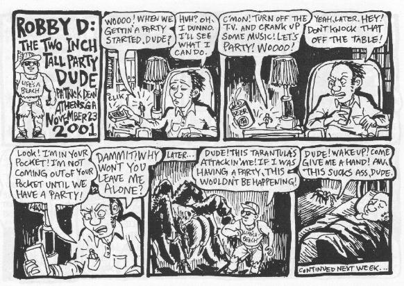 Ah, I can only hope that all the comics I got from FLUKE are this good. This looks like it was done for a local newspaper or something, as all the strips are the same basic format. If you’ve ever seen a weekly strip in a paper you know that they’re kind of hit or miss. Some weeks are funny, some are OK, and some just stink. Well, none of these are that bad and, granted, there are some that are kind of “eh”, but the funny ones are incredible. Strips that I didn’t put up here (because I didn’t want to put up the whole book) include a hillbilly yeti, Pants Man, an angry butterfly, a werewolf hand projector, Tom Selleck, and more monsters than you can shake a stick at, whatever that means. Looks, here’s one sample, and if you don’t laugh at this, don’t send this guy any money. Fair enough?