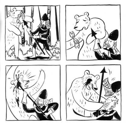 Here’s another excellent graphic novel from Colleen, and it’s further evidence (as if any were needed) that the Center for Cartoon Studies is doing some excellent work with its students. This is the story of the uprising of the bears against society, as one bear in particular (the one on the cover missing an eye) smells some fish being cooked, wanders innocently into a camp to eat them, and it attacked for his troubles. He vows then and there to take back the forest, and soon runs into a little girl (age 3) who isn’t afraid of him. Taking this for a sign, he gives her armor and puts her in charge of the first attack against the humans. Obviously she doesn’t know a thing about fighting, but the bears prevail and decide that they need to take back all the forests in the world, which brings us to the rest of the book. It details her growing up with the bears, killing all the humans that they find, and it shows her general ambivalence… until she sees up close how humans live. I’ve said more than enough already, but this book really is remarkable. It somehow manages to be, at the same time, a story about growing up, about myth and animal society, about right and wrong, the use of force and when fighting for the sake of fighting leaves all rationality behind. Colleen deftly displays these contradictions by showing a good human who only wants to paint the quiet scenes between battles (and is killed for his troubles), a stag who only wants her to learn and a young boy who, if this were a Disney movie, would be an obvious love interest. She does an excellent job with the “love interest” by keeping the story going firmly where it should go, so kudos to her for that. It’s such a damned near perfect book that I feel compelled to at least complain about one thing: the missing eye of the lead bear. Not to get all technical on you, but if a character in your story loses an eye, the same eye should be missing for the whole story. The lead bear has his missing eye drift back and forth from the left side of his head to the right and back over and over again, to the point where it was an unnecessary distraction to the rest of the story. Not enough to ruin it, or even seriously damage it, just enough to get me to wonder how such an obvious mistake could have gotten through. Eh, after two excellent books I’ll give her the benefit of the doubt and assume she was going for the old timey cartoon look, where things like that would happen all the time. This graphic novel is also only $7, is still on recycled paper, and is still a real bargain.