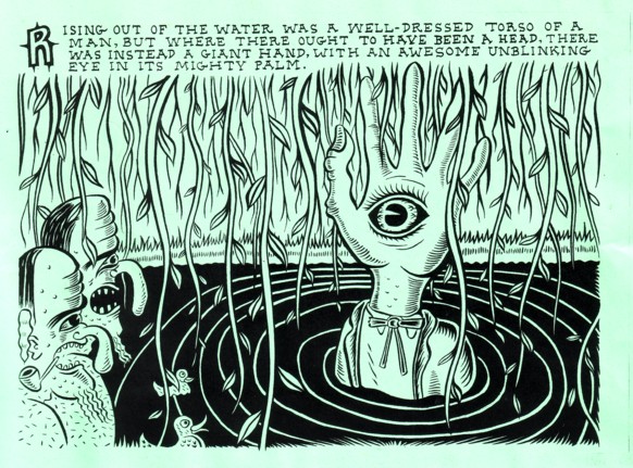 Hey look, an Andrew Goldfarb book that doesn’t deal with any of the 1000 sorrows! This is a short mini about a pair of conjoined twins (or two people sharing one circulatory system, not two different sets of people) who can’t stand each other. While fighting to the death they see that creepy thing from the front cover, who looks directly into their souls. Because naturally, you’d think that something that looks like that would be the thing that would bring two brothers together. As always with Andrew, the art in this book is gorgeous, with all sorts of little things scurrying around in the shadows. If you’re afraid of those hefty $3 and $4 price tags above but still want to check out his stuff, this $.50 cheapie is the perfect way to go.