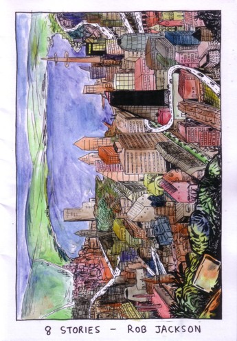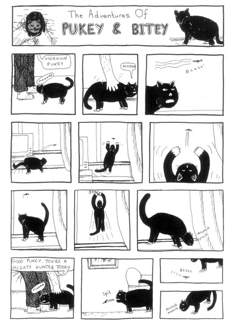 Hey, guess how many stories are in this one? Rob has to be one of the more prolific small press folks out there, which is a good thing as he always has something interesting to talk about. First up there’s the story that covers the bulk of the comic, written by Shonagh Ingram, about a city by the lake that falls in love with a reflection of itself. As you can probably guess if you’ve read the fable about the dog that sees another dog in the lake that is also holding a bone and tries to grab it, things don’t end well. Next up are a series of short pieces, one about Rob’s rules of life (part 6 in a series where the first five parts are mysteriously missing), the comic sampled below, a story about Rob finally climbing a small mountain near his home, a disgustingly hilarious piece about the Math-Ro-Mancer, and a shortie detailing something that a lot of people already know: kayaks are horrible, horrible things. Things go off the rails a bit in the last story, as Rob details his night out seeing a favorite band from his past, apparently drawing the story at the bar, if the quality of the art and the handwriting is any indication. There’s also the lovely fact that the copying was off for this story, so bits of text are chopped right off of every page, which is probably for the best as it’s mostly illegible anyway. Exceptions to the lousy art and handwriting are in the story, but overall it’s better skipped, as that still leaves you with 7 great stories. Oh, and there’s also the one on the back (which I almost missed until I scanned the comic) about a vending machine and its dream of taking over the world. OK, so it’s not a perfect comic, but anything that’s 7/8 fascinating still has a lot going for it.