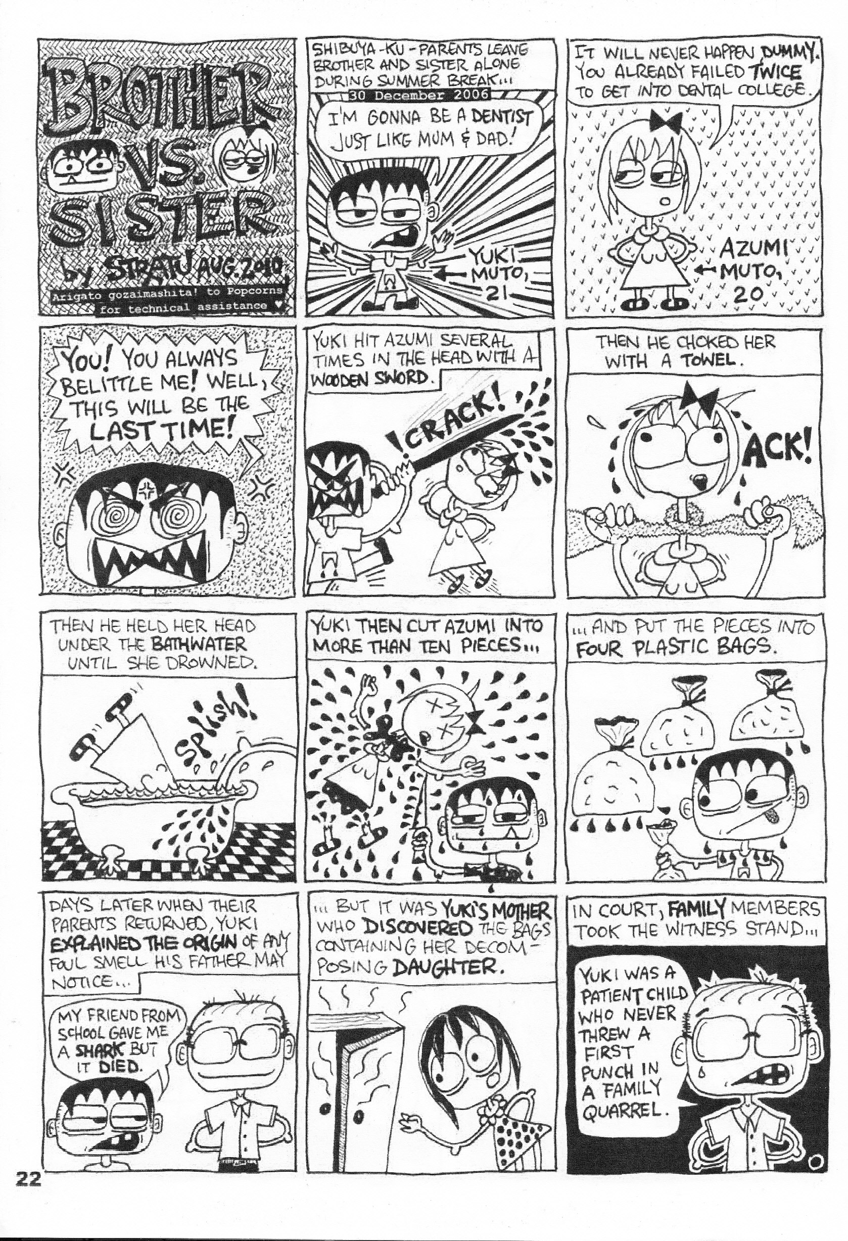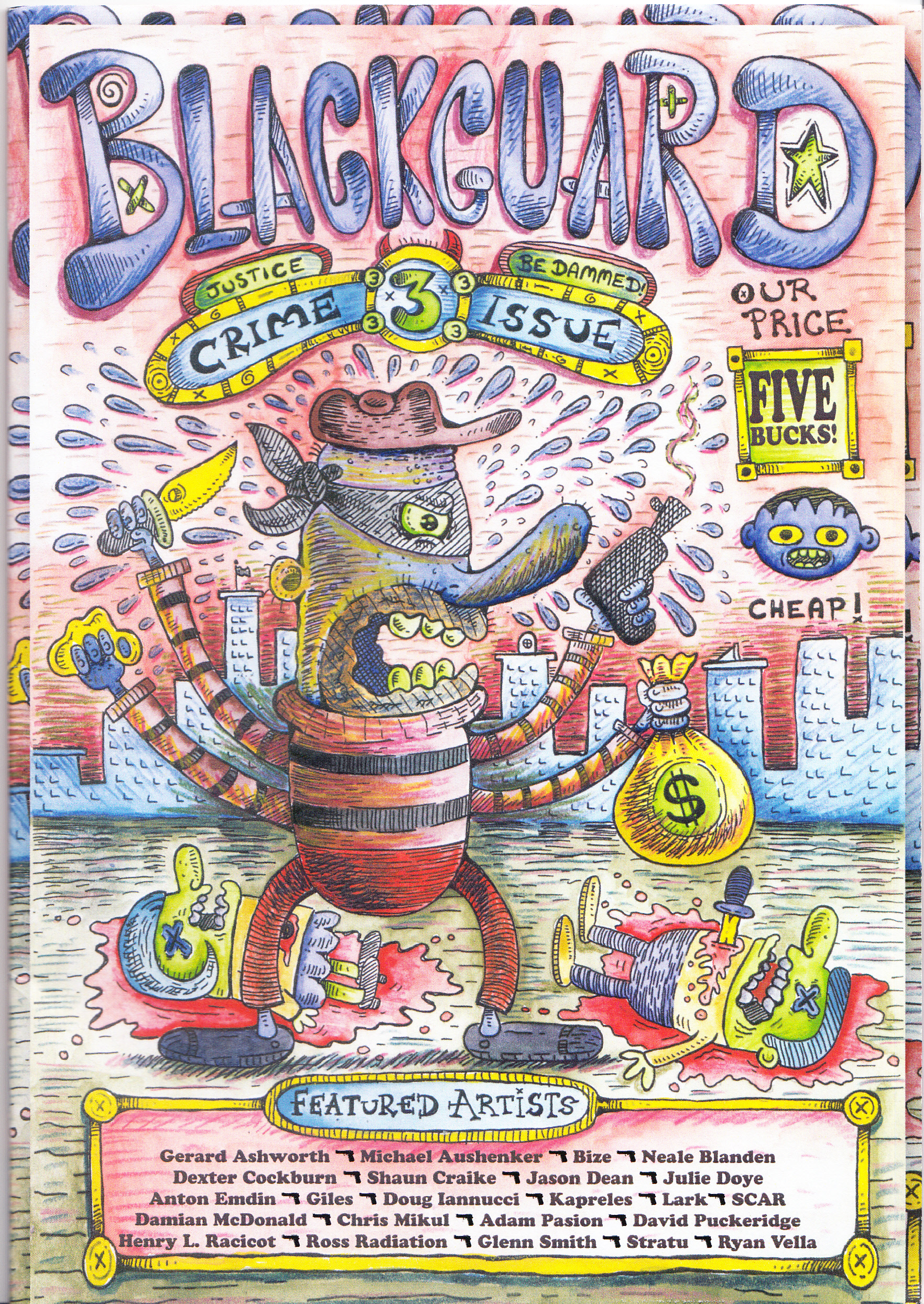The crime issue! If you’ve read past issues of this anthology and think that this is a subject that this crew could handle very well, you were absolutely correct. My only complaint is that almost the first half of the book is dedicated to a letters page and comics and zine reviews. Not that I hate such things, but sometimes it gets in the way of the actual comics, and I’m speaking from my own personal and cranky bias about getting zines and comics all jumbled up. As for the comics themselves, it’s hard not to find plenty to love. When things start off with a color strip about Nazi superzombie monkey sleeper agents (by Ryan Vella), you know you’ve reading a book with tons of potential. Well I do anyway, it’s entirely possible that such a thing would turn you off immediately, in which case I’d recommend leaving this review now. It’s OK, there are plenty of other comics to read about on this site and not a single one of them has a Nazi superzombie monkey sleeper agent to bother you. Strips include an actual serial killer and the Hamburglar discussing royalties (by “Glenno,” which may or may not refer to Glenn Smith), Adam Pasion (or his story stand-in) lighting an empty pool on fire as kids, Stratu with a brother killing his sister after a stupid argument, scribbling a penis on a “Walk” sign (by Bize), Chris Mikul with the profoundly strange story of Kenneth Neu, Shaun Craike with his crisis of conscience after his only attempted theft, Neale Blandon with the story of the property theft of Mickey Mouse, Anton Emdin with the angriest man on earth and Dexter Cockburn (with one of the few stories of his without visible sexual organs) with the story of the murder of a young girl and the enigmatic diary entry detailing the deed. There are also two text pieces by Damian McDonald and Henry L. Racicot, both of which are well worth reading. As I already gave away in the intro, this comic is well worth picking up. I only mentioned about half of the stories to leave you with a lot of surprises, and even if you think that comic and zine reviews are wasted space (and, even though I pointed them out, I did notice a few comics I should probably check out, making me a bit of a moron for even mentioning that in a negative light) there are still more than enough comics here to make this worth the $5.