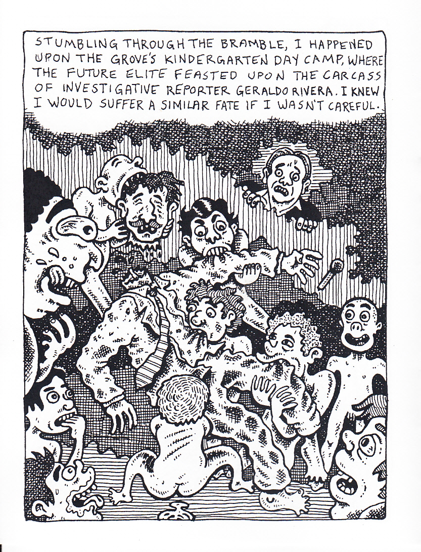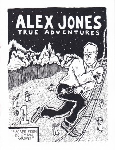 Ah, Alex Jones. I’m going to happily assume that this comic is supposed to be about the Alex Jones of radio/various conspiracy theories fame and not just a random Alex Jones, mostly because this comic would serve as an excellent origin story for the guy. Scratch that, Alex has a microphone and a tape recorder on the first page, so obviously it’s him. Anyway! This comic reads like a bizarro lament to my opinion that too few comics deal with modern political events or figures. This one has a bundle of political figures show up, and if any of them ever somehow heard of this comic I’d have to imagine that they wouldn’t be too happy about it. Buy hey, fuck ’em. This starts off with Alex on his personal tour of Bohemian Grove, the “play area for the elites,” and his confrontation with a “dandy sex toy” who seems to have stolen Jughead’s crown. From there he witnesses all kinds of horrorsĀ involving Geraldo Rivera, Herman Cain, Hilary Clinton and Bernie Madoff that I probably shouldn’t get into because of the dreaded spoilers. I will say that the ending with _____ (I’ll leave it as a surprise) in his “liberty copter” was brilliant, even if the person in question is a goldbug loon in real life. It’s a nice little piece of cathartic madness all wrapped up in eight pages. Normally I’d also complain about the lack of any contact info in this comic, but considering the subject matter I can see why Tom might want to make this a little tougher to find than most of his comics. That being the case there’s no price, but a buck or two should probably cover it.