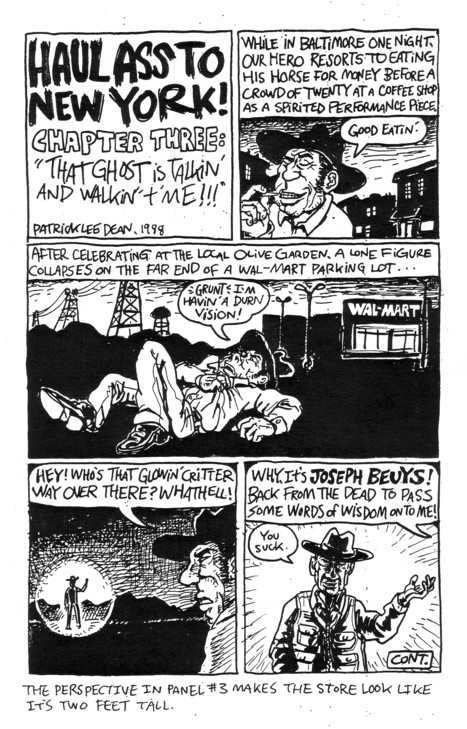 Uh oh, looks like the cover’s crooked! Oh well, you get the idea. Also, I think Patrick has a new e-mail address, which you can try by clicking on this, although the one up there might work just fine. So what’s the story with this one? I completely loved the first issue, still liked #3 a hell of a lot and this one? Well, OK, I mostly loved this one too. Strips in here tackle such subjects as the wisdom of wearing a wizard hat, what you can do with x-ray eyes really, being an outdoorsman, making it in Hollywood, floods, french doors, insomnia, how to tell if your lover is a washing machine, being a shrunken band, and the fact that werewolves are cool. Much more too, of course, and he even does a serious strip or two, but you’re going to have to buy this to find out what I’m talking about. Hey, when have I ever steered you wrong before? It’s only $2 you cheapskate you.