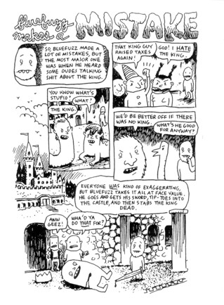 I’m taking a guess on whether “Blue Fuzz” is one word or two, but as it looks weird all lumped together I’m going with two. Another fascinating glimpse into the things I actually think about! This, clearly, is the story of Blue Fuzz, who just so happens to be a hero. He fights evil, or perhaps people who spill his beer, but things start to go wrong for him when he overhears some people badmouthing the king. Blue Fuzz, being a hero and also being unfamiliar with general griping, kills the king, and this gets him in all kinds of trouble. He chased out of town by an angry mob, has a chat with a fire he builds (the fire goes on to tell him the history of how people first got fire), descends deep into a mountain and has all kinds of adventures, cross-dresses (but for a very noble reason), tries to figure out a decent gift for the old gods and eventually lives happily ever afterish. I’m OK with spilling this large amount of beans because it really doesn’t matter. The joy in reading this comes from Jesse’s offhanded descriptions of the heroics, the full page color illustrations before and after each “chapter” (the look on his face as he stabs the king in full color is worth the price of admission) and the general awesomeness of the comic. Yeah, it’s a cheat for any reviewer to just say that a comic is great, but screw it, this comic is great. Fantastic and wonderful even. Not a bad piece or illustration in here is what I mean, and the writing is perfect for these little adventures. Buy it already! $4