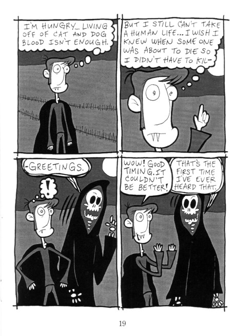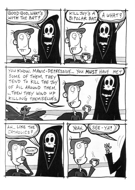 Do you people still scroll all the way down this page when I mention the updates? Brian is going to change the way these pages are set up all by himself if he keeps this up. And, seeing as how he’s been sending me these comics for most of the life of the site at this point, I don’t see him slowing down any time soon. This comic, like the last two, is comprised of daily strips, so the story kind of comes and goes. At times he seems to be focusing on a larger piece, then it stops abruptly and veers off in a different direction. There are still a few funny bits and a few groaners (nature of the beast with the pun-oriented strips), but the funny does outweigh the groaners and I like the new zombie roommate. Subjects in here include having the Grim Reaper as a friend, moaning about a lack of love life, a stoner/drunk turned into a zombie and his friends being unable to tell the difference (that one was a bit heavy-handed), being in a blues band, what’s really in your coffee, the difficulty of giving death gifts, stalking vs. courting, and being stuck with a vampire stereotype. I should also mention (in case I never have on this vast page) that Brian has been getting other artists to do representation of his characters for a while now, and this time around gets Graham Annable and Matt Metzler to do some damned impressive work. Check out the pile of free samples on his website if you need convincing, and it’s linked way up at the top of the page. $3