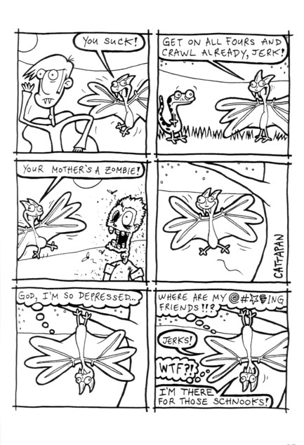More illustrations from Brian (see the above review and all sorts of other places around this website for my general views on sketchbooks), but with a twist this time: some actual comics are thrown in. The illustrations (it’s really not far to call them sketches) cover characters we’ve already seen in various Cattapan minis doing various things: Nurdy doing yoga, Zeek with a lightsaber, Nurdy as an actual girl, the two of them bowling, a vampire/zombie conversation, a zombie bride, and a sad zombie, among other things. The comics deal with food regret, absorbing knowledge, bowling, the sad love life of a vampire, and a crazy bat. I’ll say one thing for it, it’s a hefty pile of comics. I still, in my old fashioned way, prefer regular comics to this sort of thing, but if you’re a fan of Brian’s work there’s plenty to like here. If you’re just trying to check out Brian’s work, you might want to check out some of the other minis on this site and work your way up. $3
